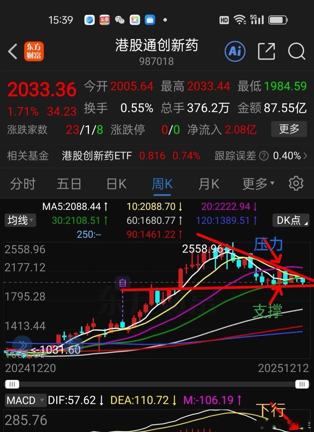 12.14周末聊基金,港股通创新药下周面临选择方向。下图是港股通创新药日线与周线走势,很明显,日线走势金属两个月都是在一个箱体内运行,大部分时间都在箱体中间位置,目前又到了箱体下沿附近,距离前期低点比较近,假如下周初港股走弱,它要回踩前低,箱体下沿支撑,守住底部区域支撑,将选择往上走,也就是说下周先抑后扬。 从周线走势来看,30周线重要支撑位已经跌破,但是在30周线附近,已经横盘震荡整理了8个星期,应该有比较强的支撑。假如守不住这个支撑区域,后期不乐观,下跌空间也就比较大啦,希望它向上走,或者继续在箱体内运行。 目前港股创新药板块还在近期低位震荡,随时可能止跌反弹回升,如果后面市场行情稳定,板块有望挑战前期高点,前提是大环境要稳定。 以上观点仅供参考不构成投资依据,点赞转发关注投资理财不迷路。