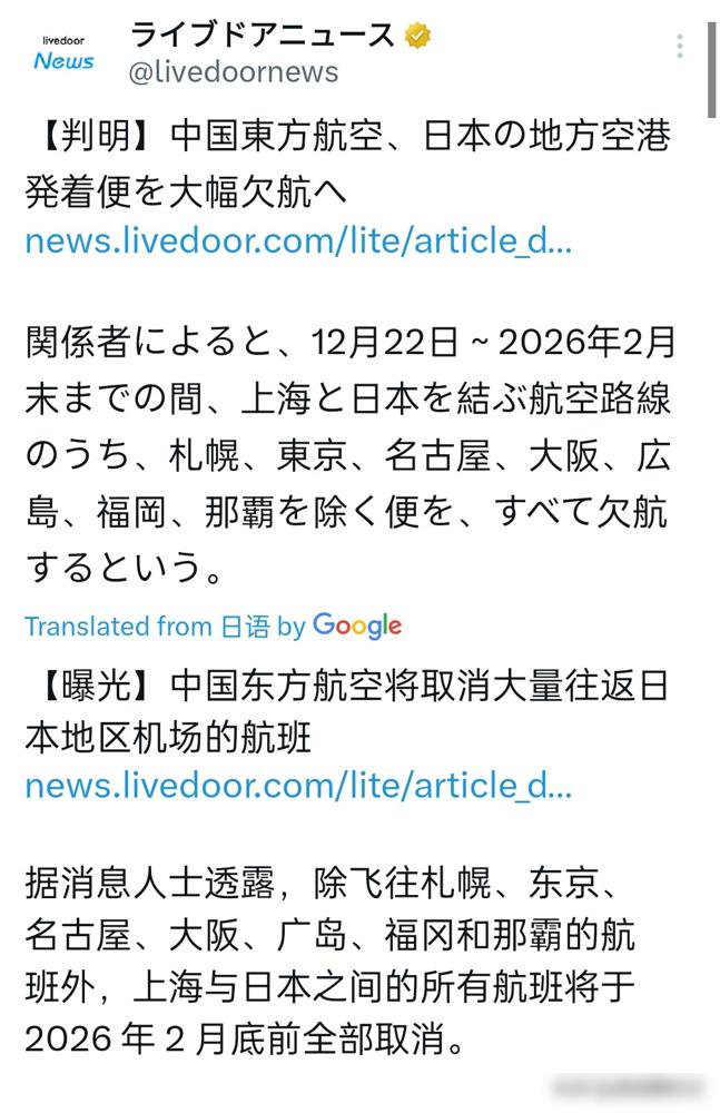 【日媒《现场新闻》报道】中国东方航空将大幅取消往返日本各地机场的航班。据日本消息人士透露,除札幌、东京、名古屋、大阪、广岛、福冈和那霸机场外,上海与日本之间的所有航班将于12月22日至2026年2月底期间取消。 看到这消息第一反应是惊讶。 但仔细一想,事情可能没那么简单。 查了下东航官网和民航数据。 根本没看到这种大规模取消的官方通知。 日媒说的“消息人士”到底是谁? 这种单方面放风,可信度要打个问号。 航班调整其实很正常。 尤其是冬春换季,航空公司会根据客流优化线路。 现在中日之间的旅客量还没完全恢复到疫情前。 保留主要城市航线,收缩一些次要航线,是商业上的常见操作。 硬要扯到其他原因,就有点想多了。 看看实际运营情况。 东航在福冈、札幌等地的航班近期都在正常飞。 甚至还在申请增加班次。 哪有什么“全面取消”的影子? 个别航线可能因为客源不足暂时调整。 但这被放大成中日起点之间的全面停航,味道就变了。 这种报道很容易带节奏。 让人误以为两边往来出了大问题。 其实民间交流和经贸合作一直很密切。 上个月中日韩刚开完领导人会议。 强调的正是加强务实合作。 航班这事儿,商业行为就是商业行为。 过度解读没意思。 咱们普通老百姓看新闻也得多个心眼。 别被片面信息牵着走。 航空公司排班有它的市场规律。 国际关系更不是靠几条航班信息就能定义的。 相信专业部门的安排。 该往来往来,该交流交流。 说到底,事实才是最好的谣言粉碎机。 时间会证明一切。 保持理性,关注官方信息。 这才是面对各种传闻时,最该有的态度。 MCN双量进阶计划