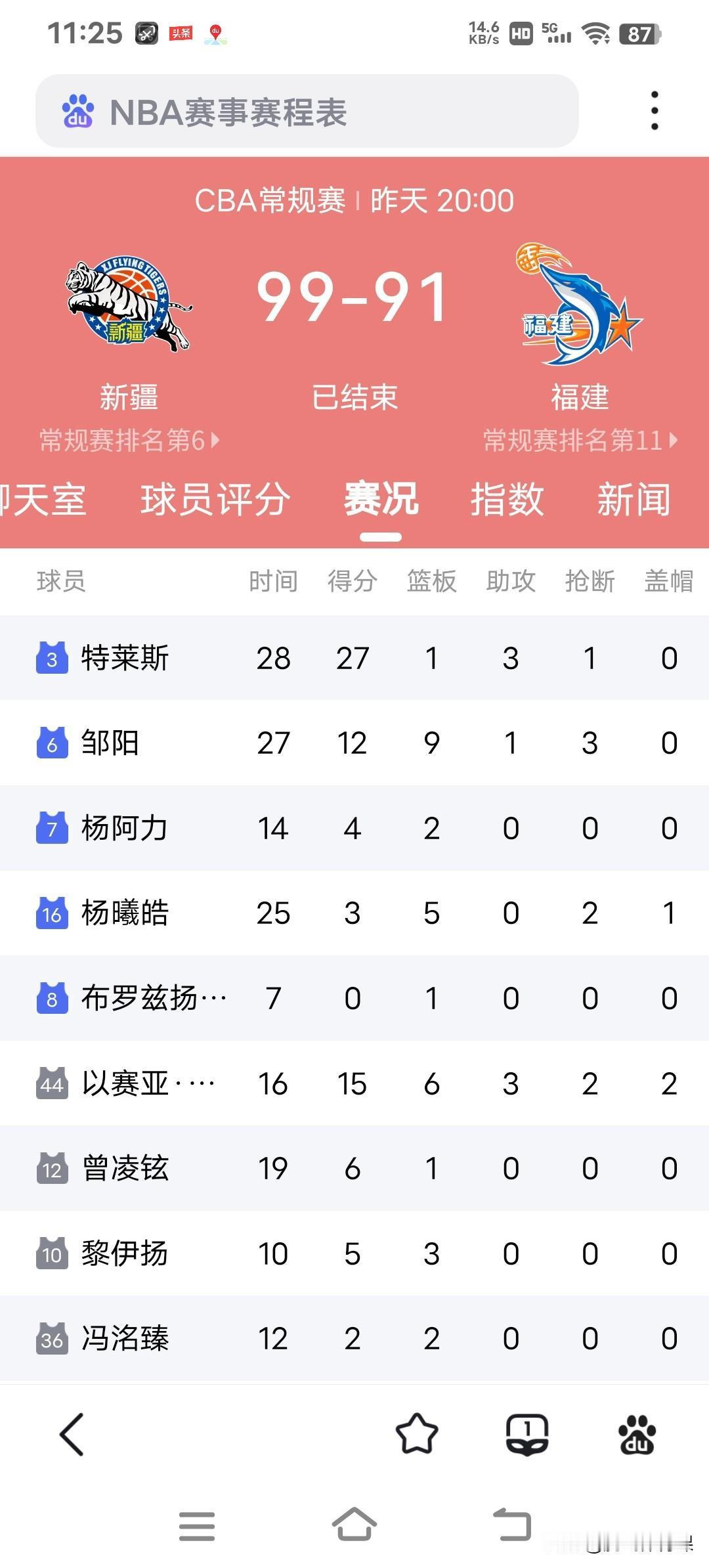 选秀状元首场演砸,福建客场91:99不敌新疆无缘开门红。 CBA常规赛首轮继续进行,福建客场挑战新疆,2025年CBA选秀状元杨曦皓的表现引人关注,可惜的是杨曦皓首演并不成功,全场出战25分钟,全场7投1中,其中三分球2投0中,罚球2投1中,仅贡献3分5篮板2次助攻1盖帽,这显然不符合状元身份,而探花新秀庞铮麟在CBA首秀中,表现非常全面,全场出战26分钟,贡献16分2篮板6次助攻2次抢断全面数据,江苏队选中庞刘铮麟确实赚大了。