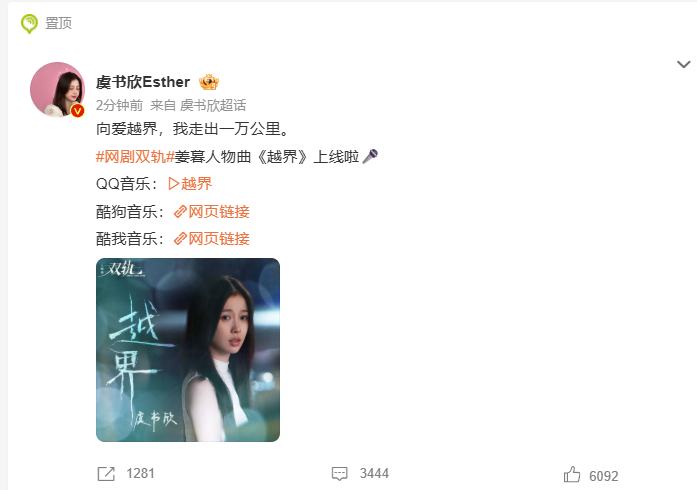 双轨人物曲《越界》由虞书欣演唱并正式上线,该曲为姜暮专属角色曲,歌声传递的细腻情