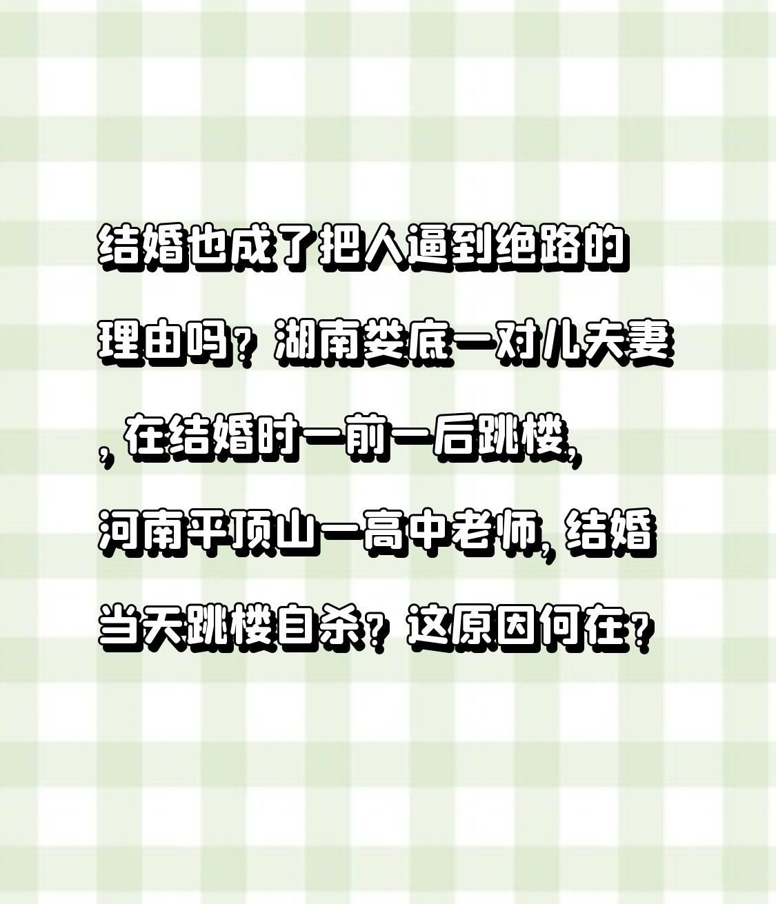 作为销售老油条,我有话要说, 结婚也成了把人逼到绝路的理由吗? 湖南娄底一对儿夫妻,在结婚时一前一后跳楼,河南平顶山一高中老师,结婚当天跳楼自杀?这原因何在? 好死不如赖活着,为啥要走到这一步呢?再说了,人的一生总得有人陪伴,如果无人陪伴,那到老了,怎么活都是个难题。