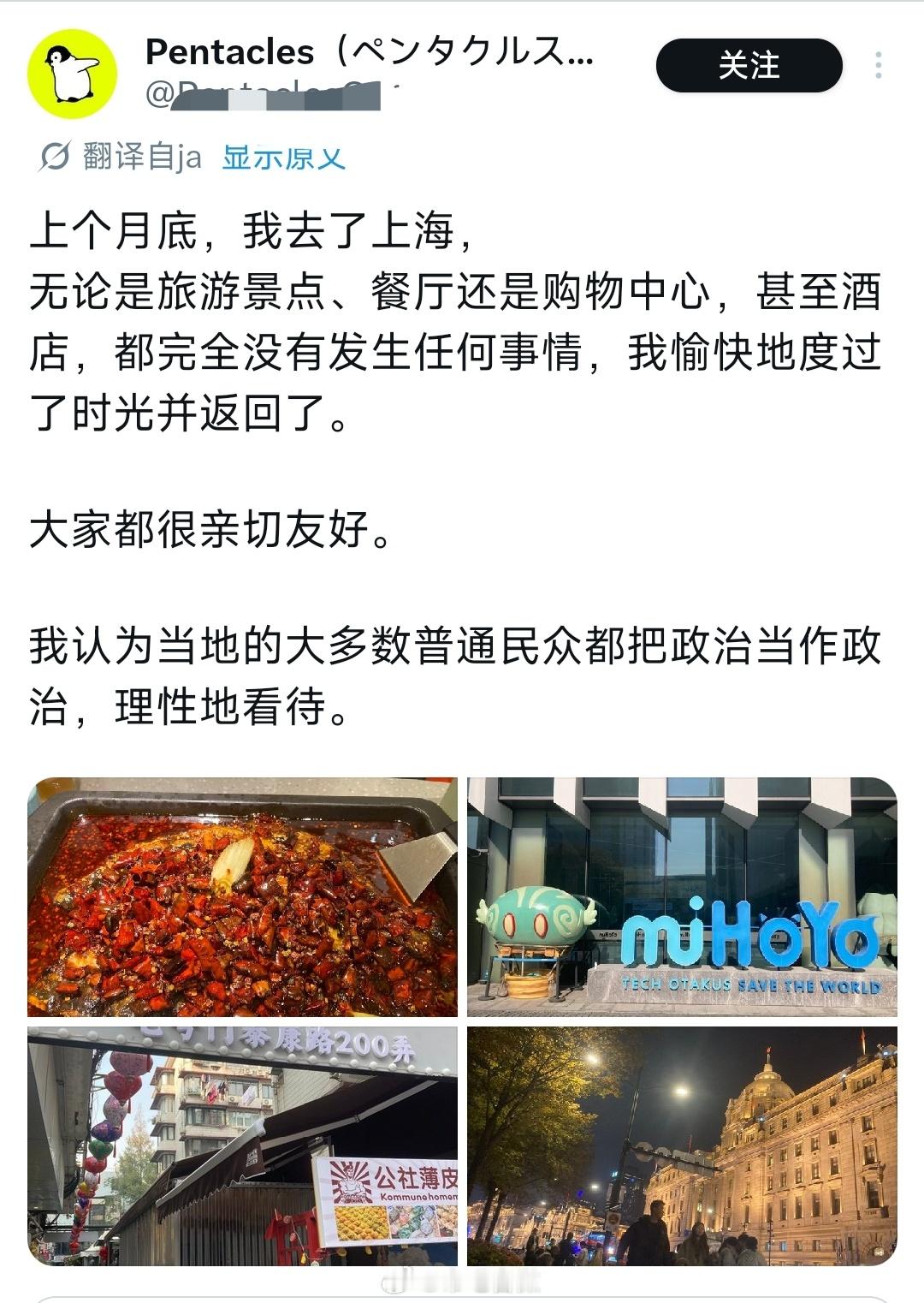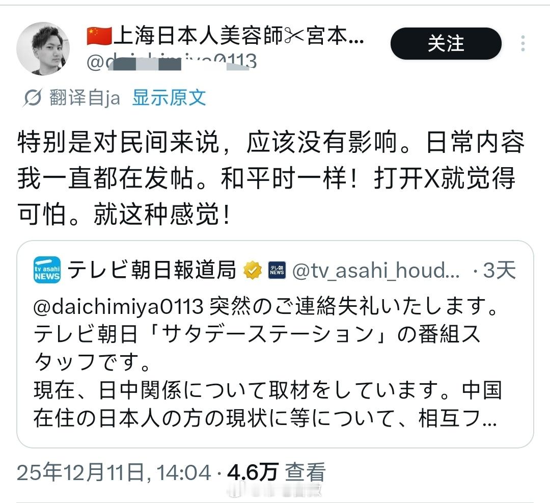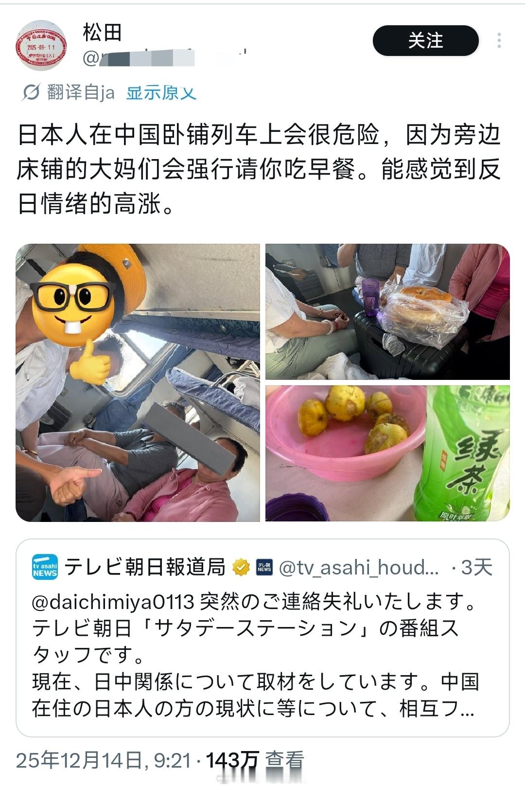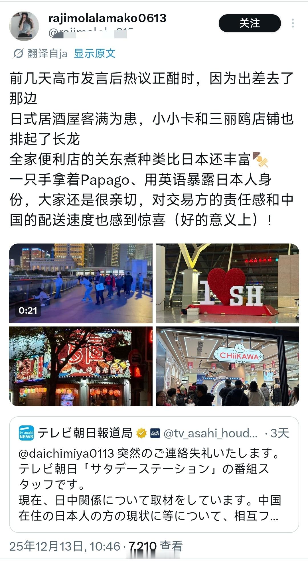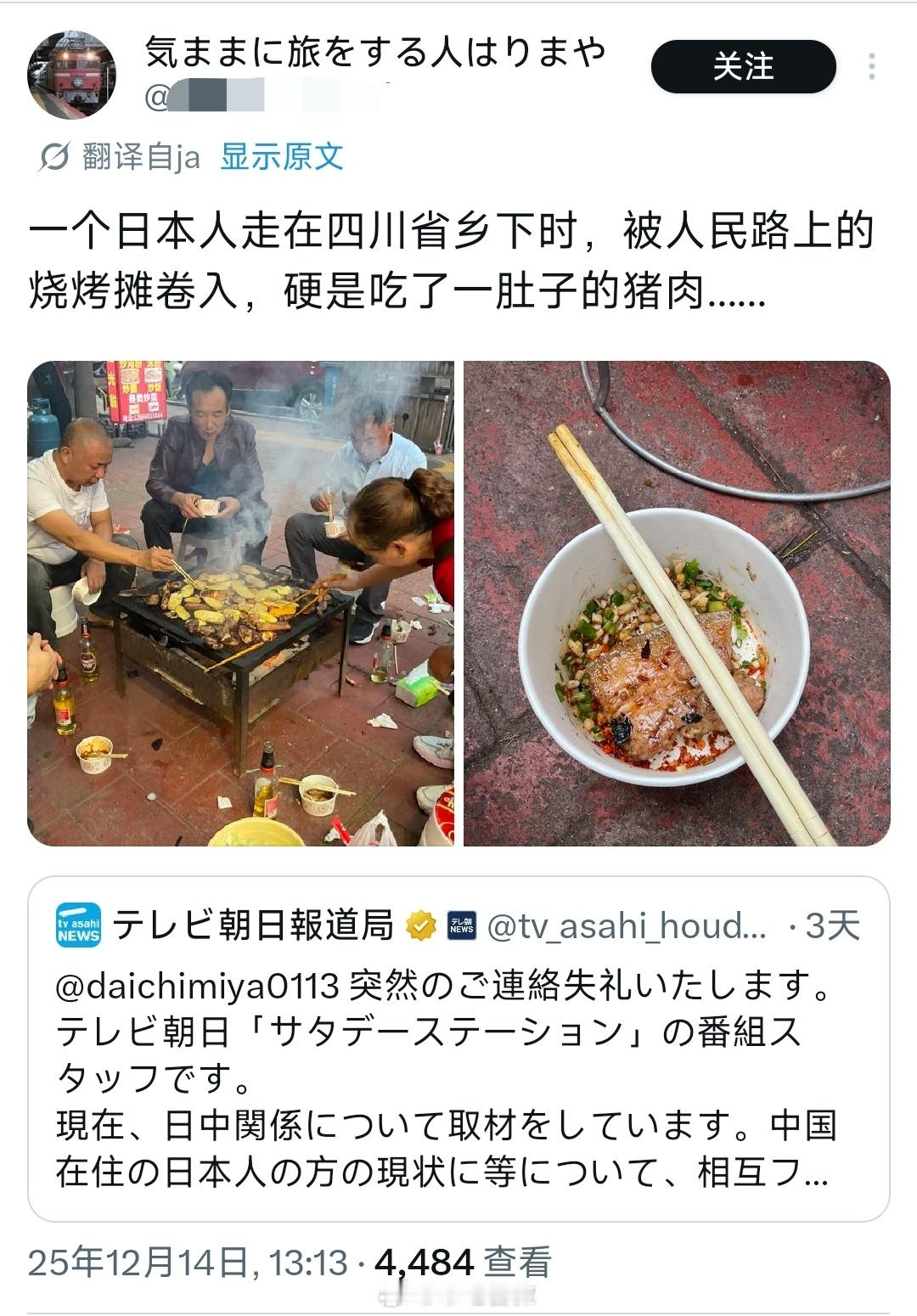 日本《朝日新闻》电视台想采访一下在华日本人的现状,结果下面的回复把日本右翼们弄红温了。⭐总之这些在华日本人,毕竟也是过日子的人,感受到了中国人的热情好客,有的发生事故了被很好的救助,有的被请客吃东西,有的表示“没有受到影响……和平时一样!但打开X就觉得可怕。就这种感觉!”⭐其实还是日本右翼们在无脑仇华,跟日本政府的纵容也有关系。日媒曾记录南京大屠杀却刻意隐瞒