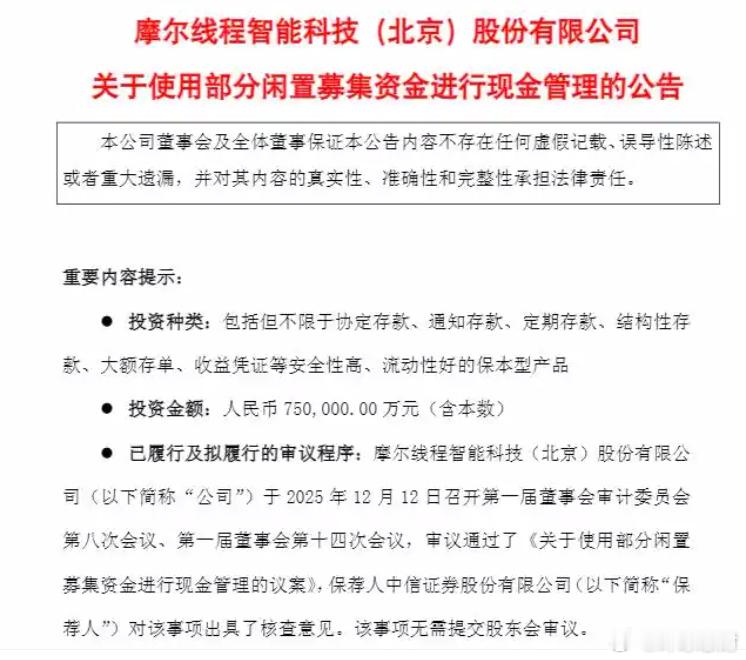 【摩尔线程回应75亿元闲资做理财】摩尔线程12日发布公告,为提高募集资金使用效率,合理利用部分闲置募集资金,在不影响募集资金投资项目建设实施、募集资金使用计划和保证募集资金安全的情况下,合理使用部分闲置募集资金进行现金管理,提高募集资金使用效益。摩尔线程表示,公司及实施募投项目的子公司计划使用最高不超过人民币 75 亿元(含本数)的闲置募集资金进行现金管理,使用期限自董事会审议通过之日起 12 个月内有效。在上述额度及期限范围内,资金可以循环滚动使用。(环球网财经综合)