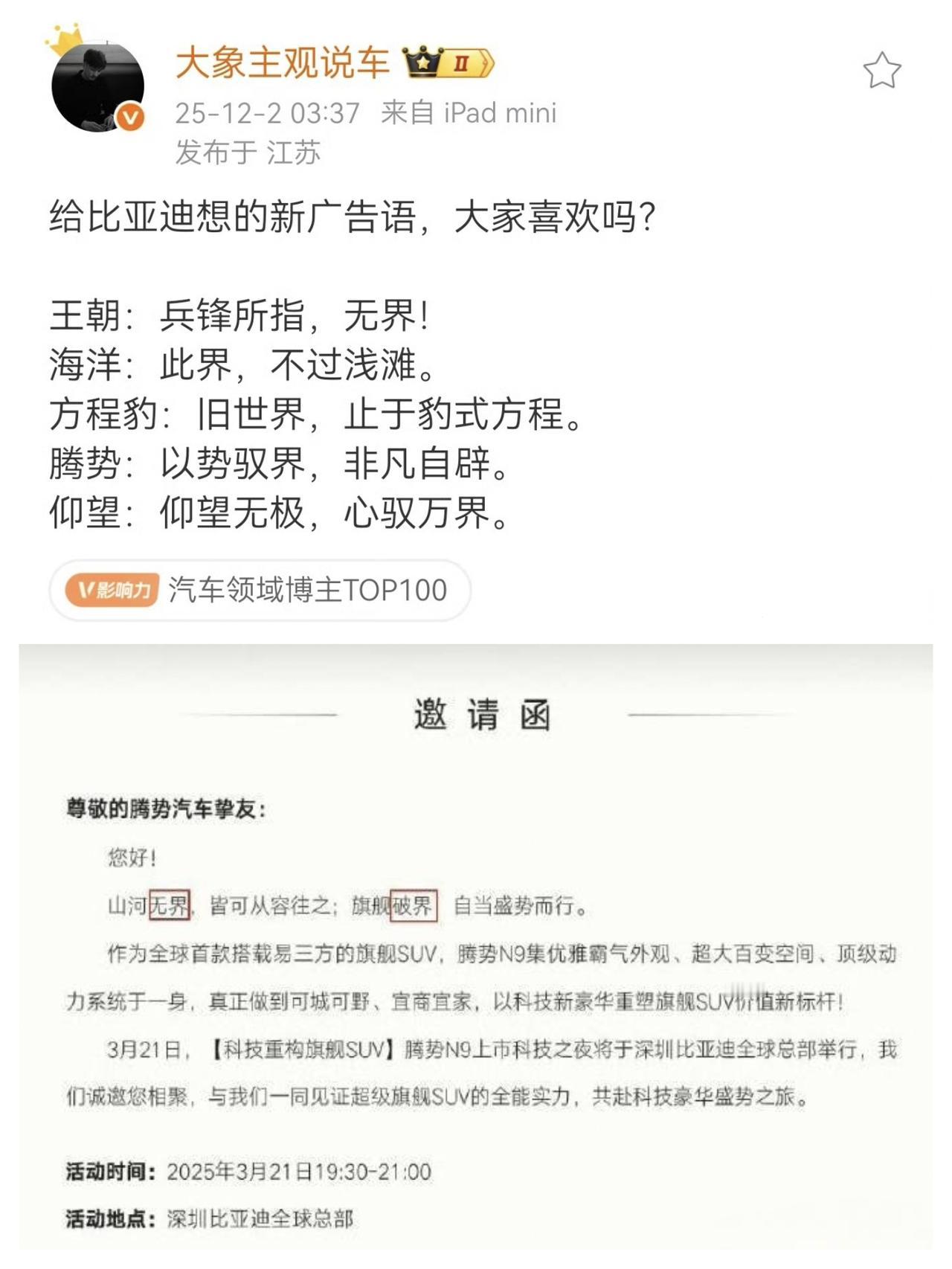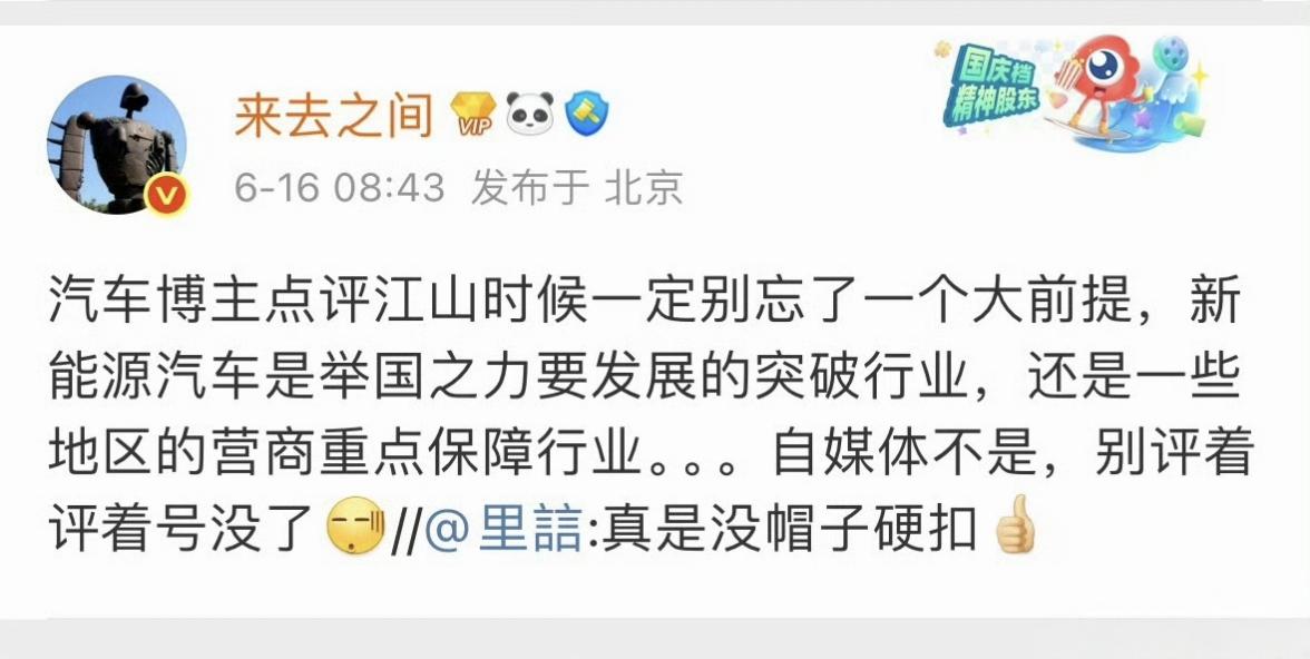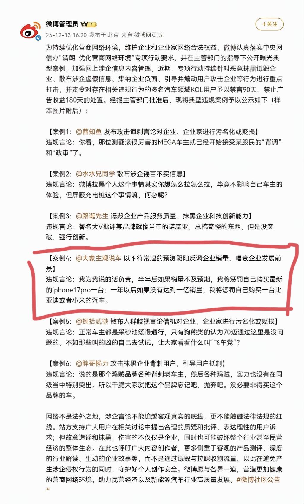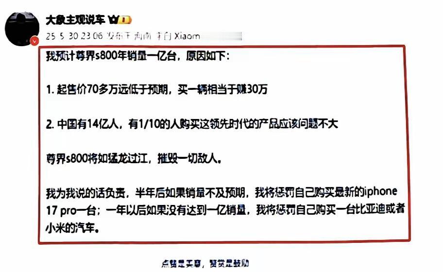 “大象主观说车”被封了,从微博管理员对他的违规行为的定性与言论摘录,我猜他应该是阴阳尊界,翻出他之前的博文一看,果然是针对尊界的。 2025年5月30日,鸿蒙智行召开尊界S800上市发布会,尊界发布会结束不到4小时后,“大象主观说车”便在微博上发文阴阳尊界。其不仅做出“尊界S800一年销量达一亿台”的极端不符合市场规律的讥讽预测,还立下“销量不达标就自购iPhone17 Pro、比亚迪或小米汽车”的赌约,这一阴阳怪气的言论,正是微博判定其“阴阳反讽、唱衰企业”的直接依据。 早在6月份,微博CEO王高飞(来去之间)就提醒汽车博主,新能源汽车是国家重点发展且受地方营商保障的行业,而自媒体无此保护属性;他警示博主点评时需把握言论尺度,否则可能面临账号被处置的后果,这也为微博后续整治汽车领域违规言论释放了信号。 这次,不仅仅是微博对“大象主观说车”禁言,他在其它平台的账号也被禁止关注,相当于全平台封号了。 而搜索“大象主观说车”的过往言论,自称“资深泰迪”的这位“大象主观说车”,不仅讥讽尊界,还对鸿蒙智行旗下的“界”品牌充满了敌意,而且还在鸿蒙智行和比亚迪之间进行明显的拉踩,如此德性,被全网封一点都不冤。尊界挑战豪车 尊界汽车 尊界 尊界S800
