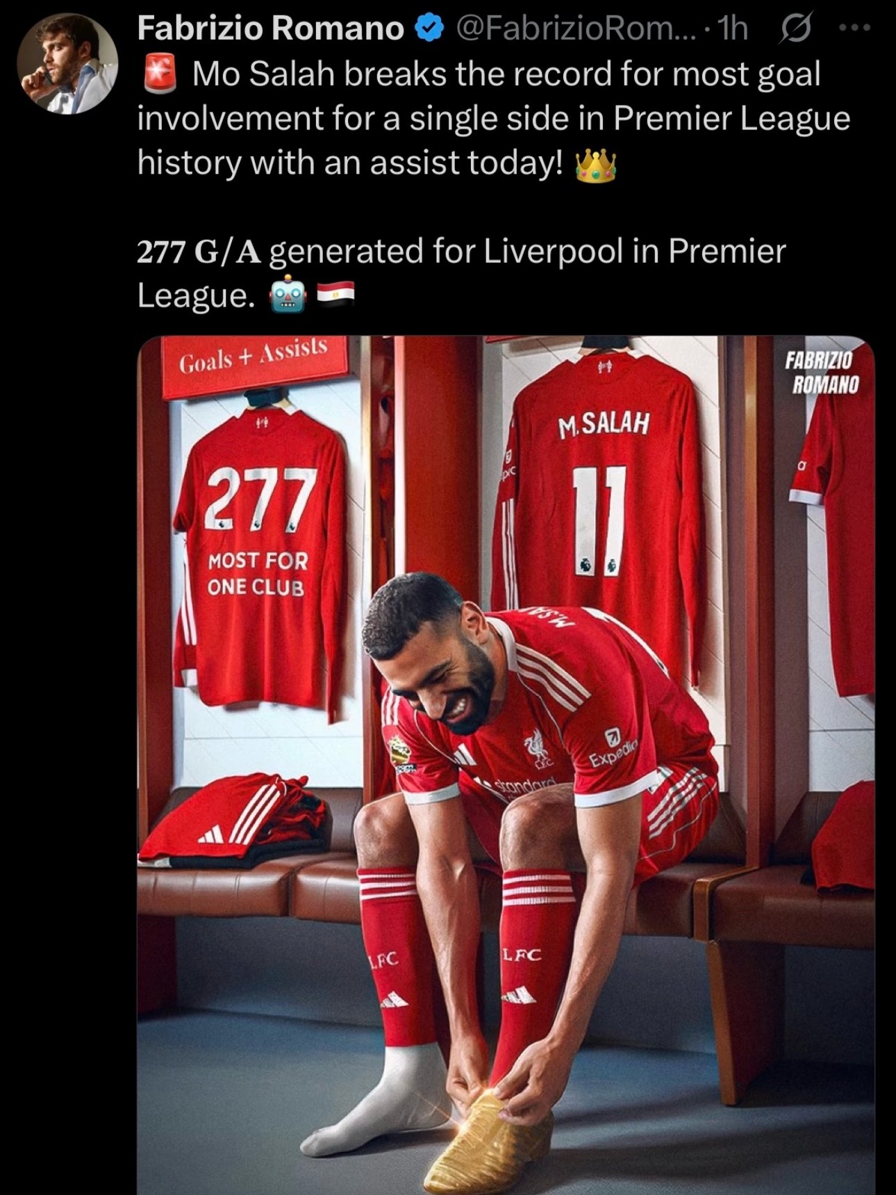 277球封神!萨拉赫超鲁尼成英超单一俱乐部参与进球王英超第16轮利物浦2-0击败布莱顿的比赛中,萨拉赫替补登场后贡献关键助攻,以188球89助的成绩单,为利物浦直接参与277粒英超进球,正式超越鲁尼的276球纪录,加冕英超单一俱乐部参与进球历史第一人。这场纪录之夜充满戏剧性,萨拉赫因近期将帅矛盾连续三场替补,第26分钟才替换受伤的乔·戈麦斯登场。仅34分钟后,他便以一记精准角球助攻埃基蒂克头球破门,既锁定比赛胜局,也完成了历史性超越。相较于鲁尼用500余场达成276球,萨拉赫仅用302场就刷新纪录,效率堪称恐怖。自2017年加盟利物浦以来,萨拉赫始终保持巅峰状态,各赛季英超参与进球数均稳定在20+,本赛季虽多以替补出战,仍贡献4球3助。他不仅是高效得分手,更完成了从边路爆点到战术核心的转型,定位球与传球组织能力日益精进,89次助攻彰显全面性。赛后英超官方第一时间发文祝贺,萨拉赫则低调表示“纪录属于团队”。这场胜利让利物浦暂升积分榜第六,为冲击欧冠资格注入强心剂。而即将奔赴非洲杯的萨拉赫,仍有望在回归后继续刷新自己的传奇纪录。