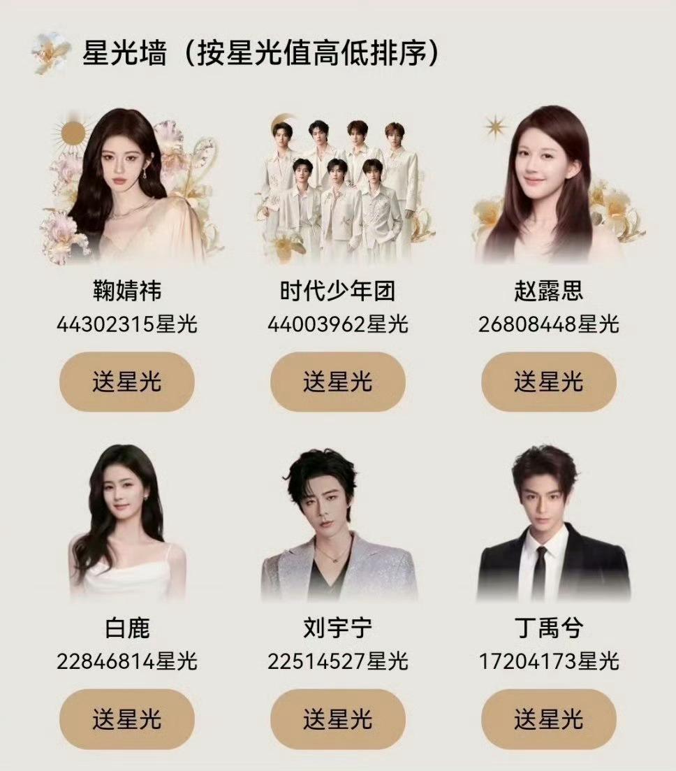 星光大赏投票去水星光墙最新战况🈶️鞠婧祎和时代少年团粉丝也太猛了吧,领先2000多w票,感觉后面四家应该没有尽全力玩了,不然差距应该也不会这么大吧
