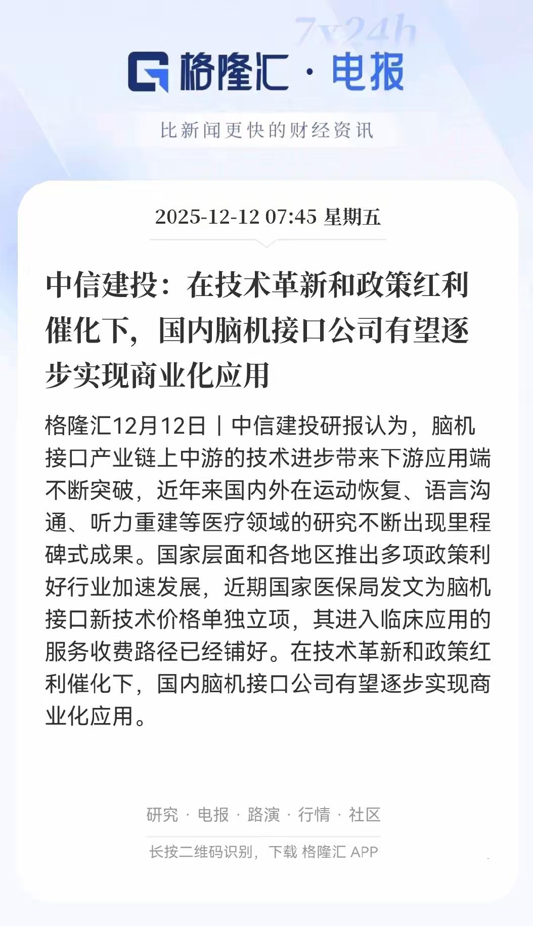 中信建投,在技术不断革新创新与政策红利的催化下,国内的这些脑机接口公司有望逐步实现商业化应用! 脑机接口的商业应用非常广泛,在医学领域,有相当大的发展前景,能人文交流同样有很大的空间,甚至在未来智能化装备的控制,甚至远程控制都有很大的商业应用场景!脑机接口这个技术应用场景不是单一的局限哪个行业,而是多行业,多场景的运用!未来在这个方面的发展可能会实现其他的技术突破!甚至可能实现人类用意念控制其他设备以及网络神经连接!