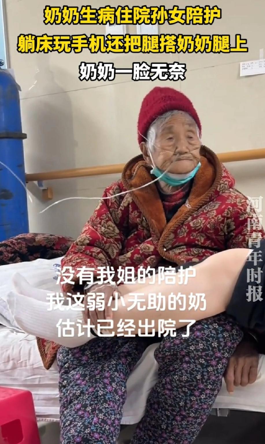 河南一奶奶生病住院孙女陪护,结果奶奶吸着氧气坐着,孙女躺着玩手机还把腿搭在奶奶腿上。奶奶一脸无奈,但用手扶着白嫩又粗壮的大腿,生怕孙女掉下来。 别看孙女这样,她是真的爱奶奶的,不爱的都不来,躺自个被窝里玩手机了。是真爱,是孝顺,只是不多而已。 奶奶的表情生无可恋,完美的诠释,什么叫弱小可怜无奈又无助迷茫。其实奶奶想让她走,又不知道怎么开口。 真是隔代亲,奶奶在你8斤的时候开始抱,结果现在180斤了,仍旧在抱着你。
