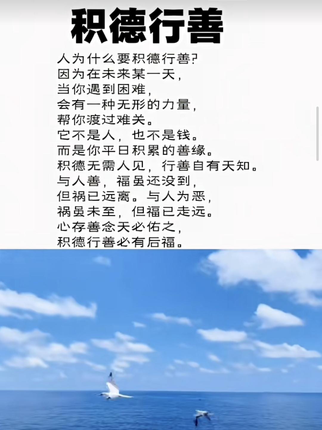 山坡羊·积德行善 积德为善, 心无旁念, 他日困厄凭缘免。 善名传,福根牵。 无形助力难关遣, 善念能将灾祸远。 行,好运连; 停,恶运牵。