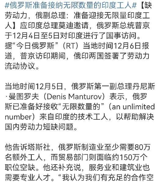 俄方:已准备好迎接无限数量的印度技工 俄罗斯人口老龄化化,出生率低,然后本国的斯拉夫人前线伤亡惨重,内部又引进印度人。 同样操作的还有德三,德意志区二战前人口1.1亿人,结果希特勒让德国人也是伤亡惨重,战后引进土耳其人,现在德国从单一民族国家变成了移民国家。 堪称民族主义的笑话。 我是不是可以这么理解: 为了给印度男性青壮年腾出发展空间,皇俄把俄 罗斯男性青年送上前线当耗材。 这么来看,俄罗斯民族的青年要么在莫斯科-圣彼得堡醉生梦死,要么在前线当炮灰,本国大后方是大量中亚的穆斯林和印度劳工。
