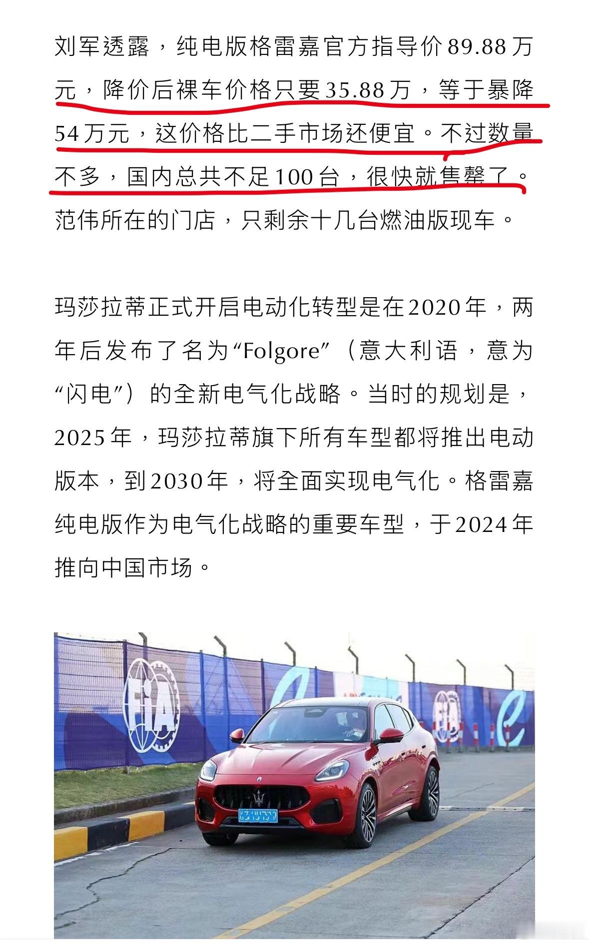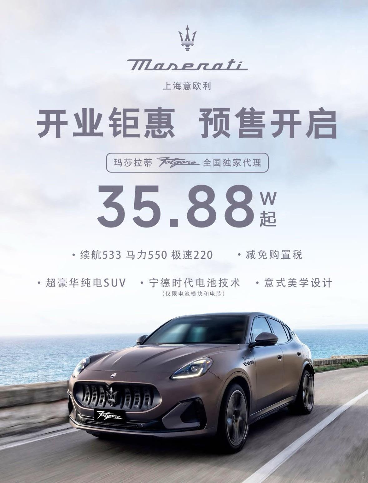 35万纯电玛莎拉蒂被一抢而空官方指导价为89.88万,现在一口价38.88万元,加上1.79万元的选配,只选装轮毂,不带天窗,最低40万元出头就能落地。玛莎拉蒂和小米理想一个价格了,如果是你你会选择买谁?