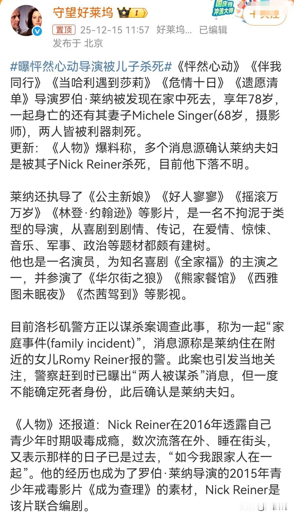 这真的是太令人发指了,这是一起人伦惨剧。 曝《怦然心动》导演被儿子杀死。 儿子是个瘾君子。 这儿子杀害了自己的父母。 是被利器刺死的。 犯罪分子下落不明。 一定要早日抓住。