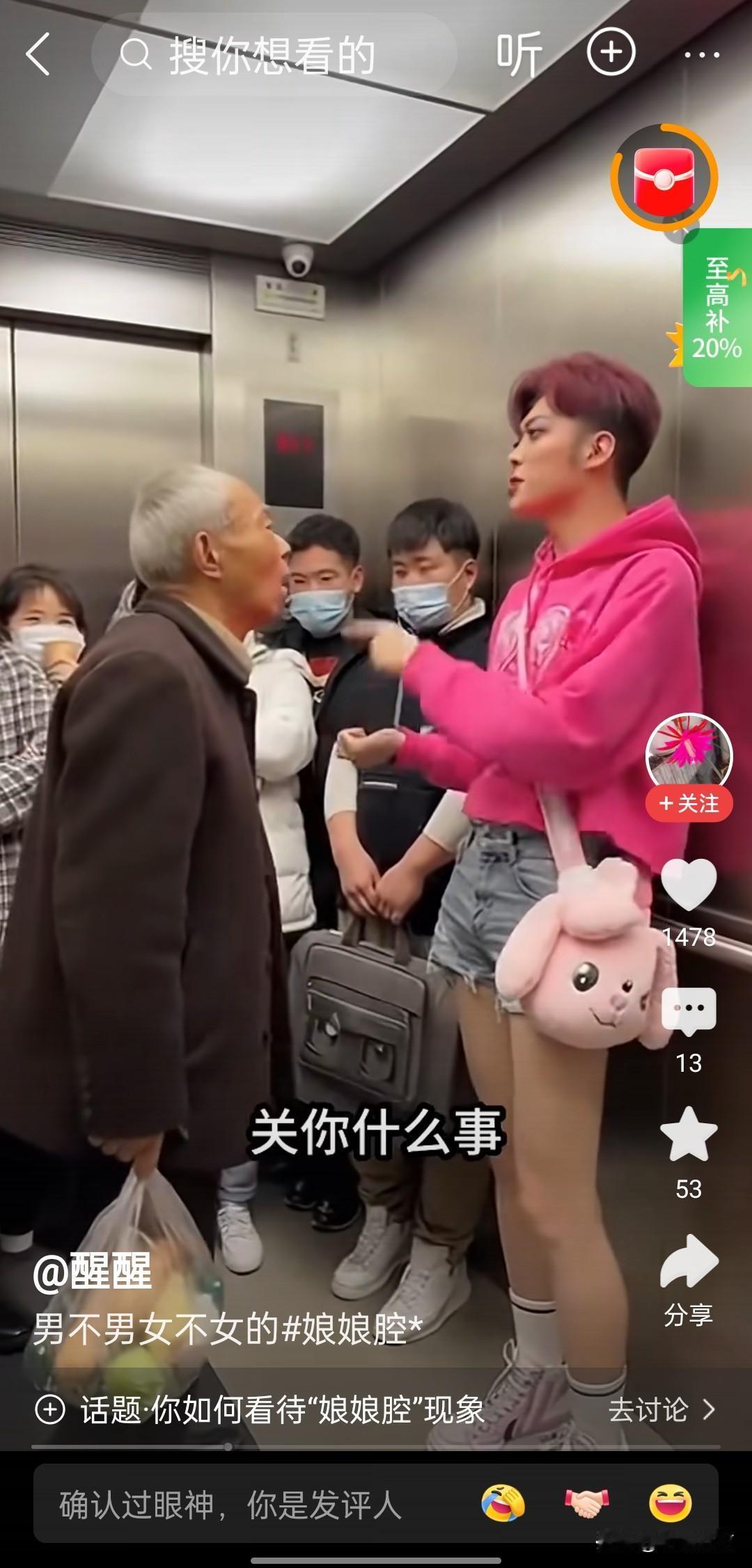 刷到一个视频,好象是在电梯里,一个小伙子打扮得比较女性化,大爷看不上眼,说“男孩子公共场合打扮成这样,不害臊么?”,小伙儿则回怼“我爱怎么穿就怎么穿”。穿女装的大男孩 两边都有道理,大爷坚持传统看法,男人就应该有男人样儿,看不过去就要批评;小伙儿则觉得自己的着装自己做主,只要不违法,别人无权干涉。如果双方都能和气一点,大爷客气提醒,小伙儿平和回应就更好了。大爷有句话说得挺好,“我提醒你穿着有点儿分寸”,其实大家都该有些分寸感,即便不认可,也可以理性沟通,尊重别人的权利。[作揖]女装男生
