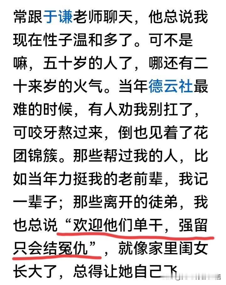 郭德纲刚刚发表了一篇文章,回应了关于相声“俗”的问题以及过去的恩恩怨怨。 说有人台上高雅,台下骗钱,俗就俗吧,懒得争辩。 这对于那些想离开的徒弟,欢迎他们单干,强留只会结冤仇。 年过50看开了很多,对过去的人和事儿肯定不会全部都忘了,但是没有时间记仇。