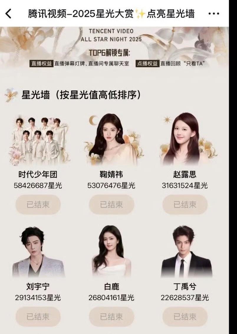 星光大赏星光墙最终结果前六是:时代少年团 鞠婧祎 赵露思 刘宇宁 白鹿 丁禹兮恭喜这六家粉丝,星光大赏都🈶️专属机位星光大赏星光值最终TOP3