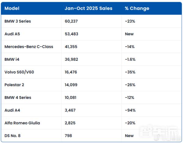 📊欧洲豪华中型轿车市场遇冷!前 10 个月销量同比大跌 19%宝马 3 系降 23%,奔驰 C 级降 14%,沃尔沃 S60/V60 跌幅更是高达 35%👉车队采购锐减 30%+ 消费者转投中型 SUV 成主因🚗纯电车型相对抗跌,宝马 i4 仅降 1.6% 欧洲车市 豪华轿车销量 汽车市场分析