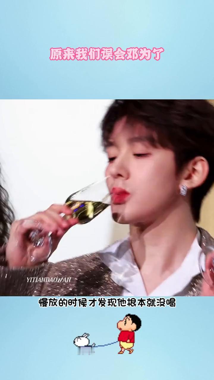原来我们误会邓为。 一开始以为邓为参加活动搞特殊,看到他喝酒的杯子有雾气,还以为他的杯子里装的是热茶,没想到居然是因为他酒精过敏,根本不能喝酒。慢放的时候才发现他根本就没喝,只是沾了一点在嘴唇上面。有雾气是因为假装喝的时候不小心往杯子里哈了一口热气,杯子里的雾气持续好几秒才消退,他这肺活量真是了得。