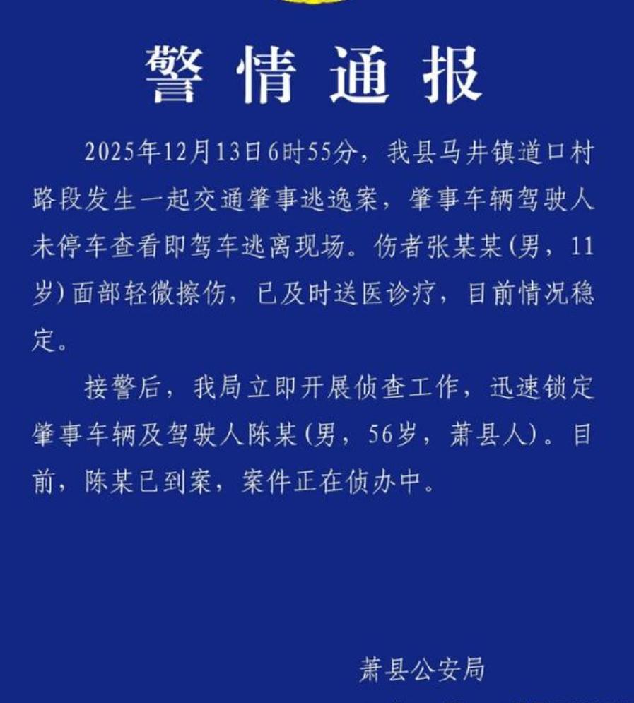 发生在萧县这起交通事故,还好没有造成严重后果,11岁男童被撞到后,自己爬起来,呼喊着妈妈,送医后,面部擦伤,目前情况稳定。 肇事司机已被警方找到,案件处于侦办中。 这起事故令人气愤的不是小货车司机的逃逸行为,而是面对停下的校车,他居然一点礼让意识都没有! 这说明我们在校车路权的法律法规和司机教育方面有所欠缺。 这点应该虚心向有关国家学习!别的方面可以喷,但是这方面我们差的不是一点半点。 关爱孩子,不能停留在口号上。