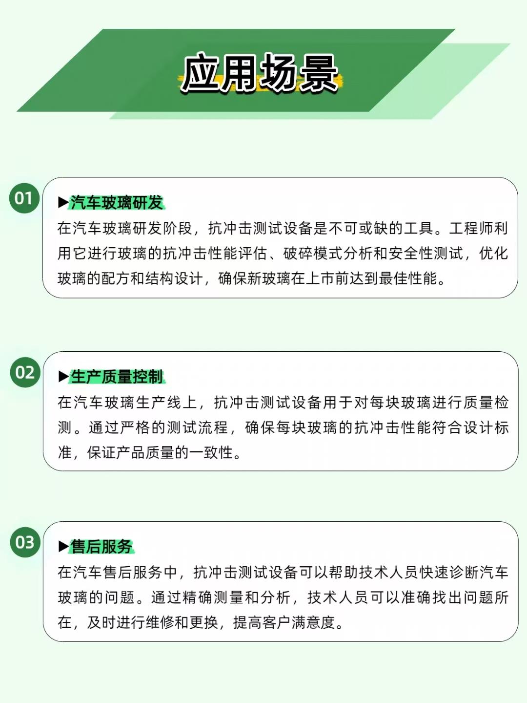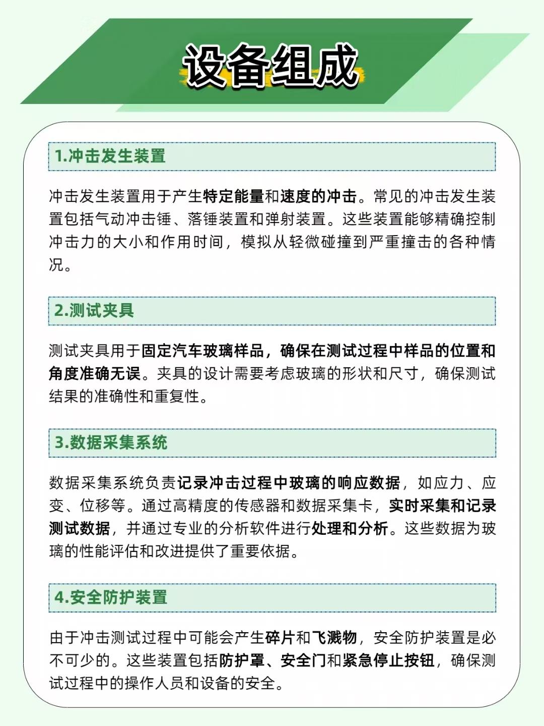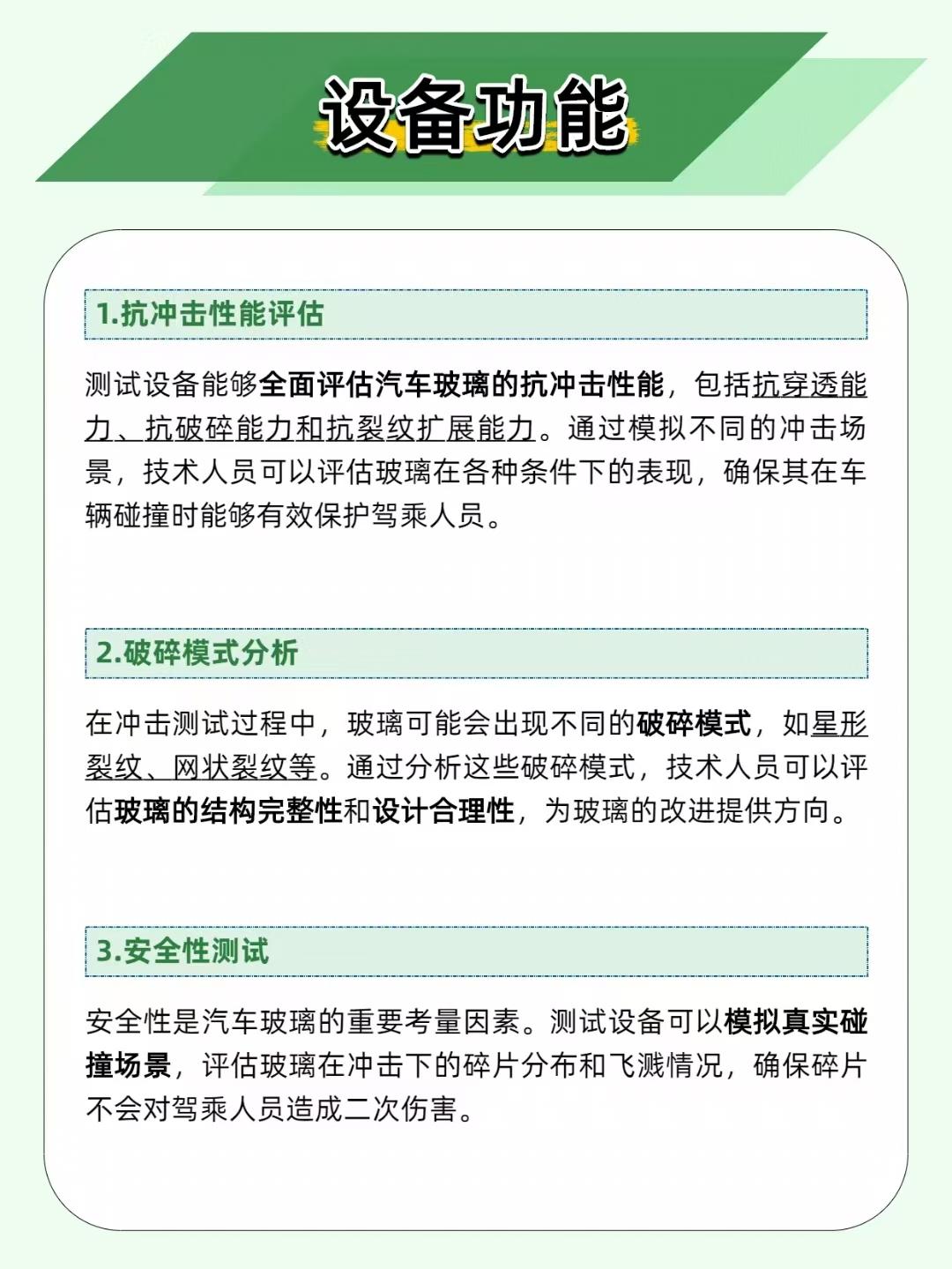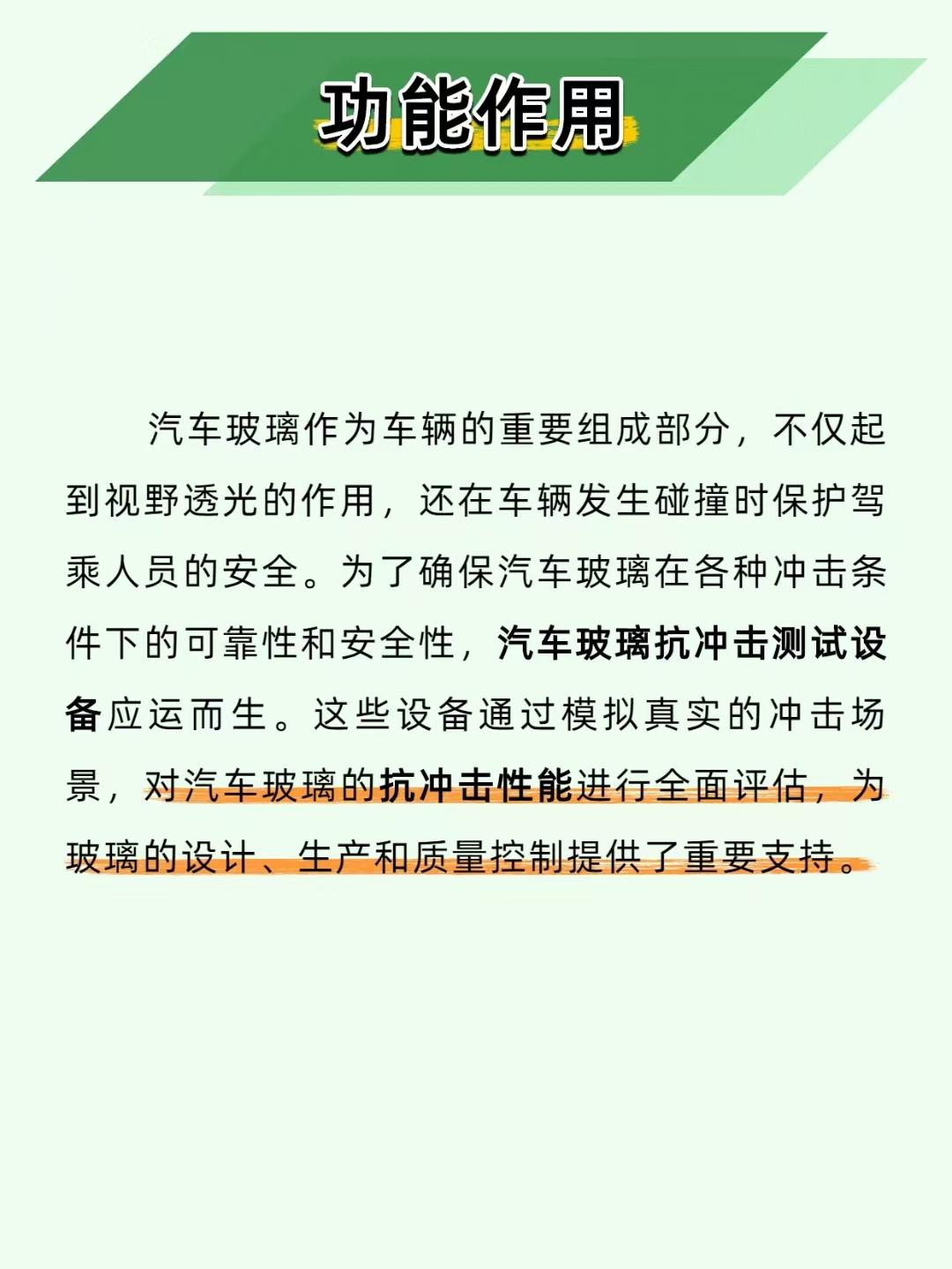 《汽车玻璃的 “安全考官”:这设备决定碰撞时你会不会被碎玻璃伤着!》 汽车玻璃可不只是挡风 —— 碰撞时它是保护你的 “安全盾”!那咋确保这盾靠谱?全靠【汽车玻璃抗冲击测试设备】当 “严考官”,把危险拦在车外!🚗💥 ————————————————————————————————— 这设备是干啥的? 汽车玻璃在碰撞时得扛住冲击、还得避免碎玻璃乱飞伤人,这设备就模拟各种冲击场景(小磕碰到严重碰撞都有),测玻璃的抗造能力,给设计、生产、质检兜底~ ————————————————————————————————— 设备 “考官团” 都有啥? 🔨冲击发生装置:像 “精准打玻璃的武器”,能控制力度 / 速度,从轻轻撞到狠砸都能模拟 🧰测试夹具:把玻璃固定得稳稳的,保证测试结果准 📊数据采集系统:记玻璃被撞后的应力、裂纹,给改进玻璃当 “笔记” 🛡️安全防护装置:防碎玻璃溅出来,保护测试人员 ————————————————————————————————— 它测的都是保命的事儿! ✅ 抗冲击测试:看玻璃撞不撞得穿、裂不裂得开,碰撞时能扛住 ✅ 碎纹分析:玻璃裂了是星形还是网状?揪出设计漏洞 ✅ 安全测试:确保碎玻璃不会变成 “飞镖”,碰撞时不二次伤人 ————————————————————————————————— 在哪能用到这设备? 🔬玻璃研发:优化玻璃配方 / 结构,让新玻璃更抗撞 🏭生产质控:每块玻璃都测,出厂都是 “合格盾” 🛠️售后:玻璃有问题?用它快速查毛病 你们开车遇到过玻璃被小石子砸的情况不?评论区说说当时慌不慌~😉