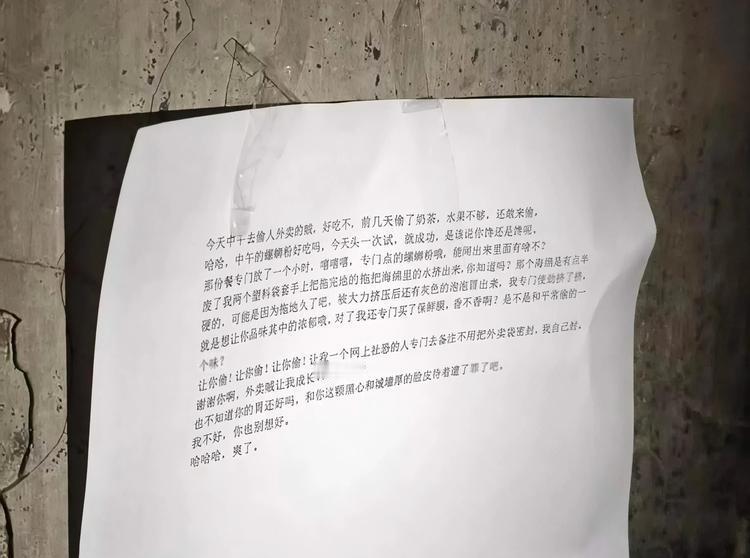 偷外卖竟偷到“加料套餐”?这次她彻底栽了。 广西某高校近日上演了一出令人瞠目的真实剧情:一名多次偷拿他人外卖的女子,这次终于“中招”——她偷走的一份外卖里,竟被“加料”了粪便。直到吃下后察觉异样,细看汤底才恍然大悟。 据悉,该女子已是外卖偷窃的“常客”。苦主忍无可忍,特意点了一份气味浓烈的螺蛳粉作掩盖,将浸过排泄物的海绵汁水掺入粉中,只为给她一个教训。 更让人哭笑不得的是,该女子事后竟还理直气壮地报警,要求点餐者赔偿。然而事实清楚:她不仅涉嫌多次盗窃,还涉嫌故意损坏他人物品,追责起来恐怕自己难脱干系。如此行事,实在不知“丢人”二字何写。 此事已在校园传开,不知她今后是否还敢继续伸手。而对那位巧妙反击的同学来说,这大概会成为一则带着苦笑却又大快人心的记忆。 你遇到过外卖被偷的情况吗?欢迎留言。