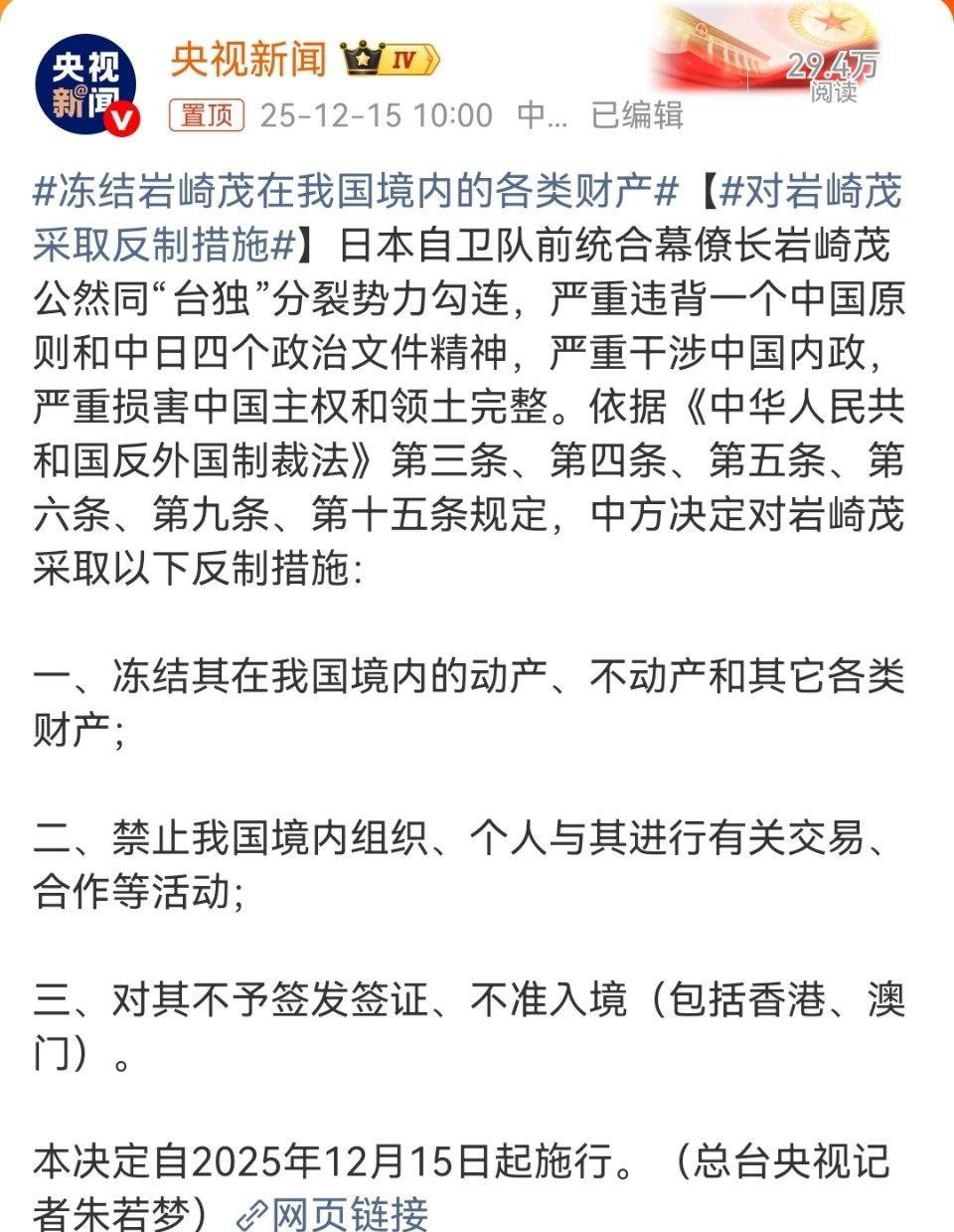 2025年12月15日,中国外交部一纸反制令,给日本退役将领岩崎茂来了记"精准拆台"——冻结在华财产、禁绝交易合作、拒发签证入境,理由直戳要害:与"台独"势力勾连,公然踩踏一个中国原则的"红线"。这出戏码,倒应了老祖宗那句"搬起石头砸自己的脚",岩崎茂怕是没想到,自己精心布局的"台海代理人"戏码,竟演成了国际政坛的"现世报"。 再看台湾当局,活脱脱一副"揣着明白装糊涂"的做派。一边喊着"两岸和平",一边把"台独"当"续命丹",拉日美当"保护伞",硬生生把2300万台湾同胞往"政治炮灰"的位置上推。这让我想起歇后语"猪八戒照镜子——里外不是人":赖清德之流以为抱紧外部势力大腿就能"挟洋自重",殊不知在14亿中国人眼里,他们不过是跳梁小丑,连"棋子"都算不上——毕竟棋子尚能左右棋局,而他们连"弃子"的价值都快耗尽了。 岩崎茂这位"退役老将",本该在家含饴弄孙、反思军国主义余毒,偏要学那"老猫枕咸鱼——越躺越咸(闲)",非要蹚"台独"浑水。他大概忘了,当年日本军国主义者"蛇吞大象"的美梦是怎么碎的?如今又重蹈覆辙,当起"台独"势力的"打气筒",活像《伊索寓言》里那只帮狐狸偷鸡的黄鼠狼——"助纣为虐"四个字,简直是为他量身定制。更讽刺的是,面对中方严正警告,他还摆出"不到黄河心不死"的架势,继续给"台独"递刀子,这不是"鸡蛋碰石头——自不量力"是什么? 古人云:"多行不义必自毙。"岩崎茂之流的表演,恰似"秋后的蚂蚱——蹦跶不了几天"。他们以为靠几句虚张声势的"挺台"表态就能撼动中国主权?却不知一个中国原则是国际社会公认的"铁律",是写在联合国决议里的"定盘星",任谁搞"台独"分裂,都是"竹篮打水——一场空"。 此番事件倒给世人提了个醒:那些妄图"以台制华""倚外谋独"的势力,不妨重温下《左传》的警训——"非我族类,其心必异";也该记住中国那句老话:"玩火者必自焚"。台湾问题因民族弱乱而产生,必将随着民族复兴而解决。所谓"台独"分裂图谋,不过是历史洪流中的"螳臂当车";和平统一、民族复兴,才是两岸同胞共同的"阳关道"。 至于岩崎茂们,还是省省吧——与其在错误的路上"一条道走到黑",不如学学"浪子回头金不换"的智慧。毕竟,中国的统一大势,从来不是几个跳梁小丑能挡得住的!
