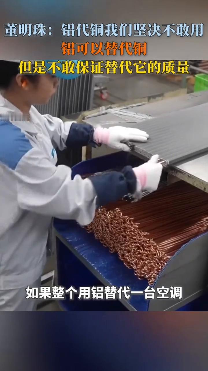 董明珠:铝代铜我们坚决不敢用。 格力电器董事长,全国人大代表董明珠。 最近网上在传所有的空调都用铝代铜了,铝代铜我们坚决不敢用。为什么?因为铝在我们检测和试验工厂一直在用这个技术准备突破。但是我们认为到今天为止铝可以替代铜,但是不敢保证替代它的质量。如果整个用铝替代一台空调,相差488块钱的原材料成本,这就是我们不选择铝的重要原因。