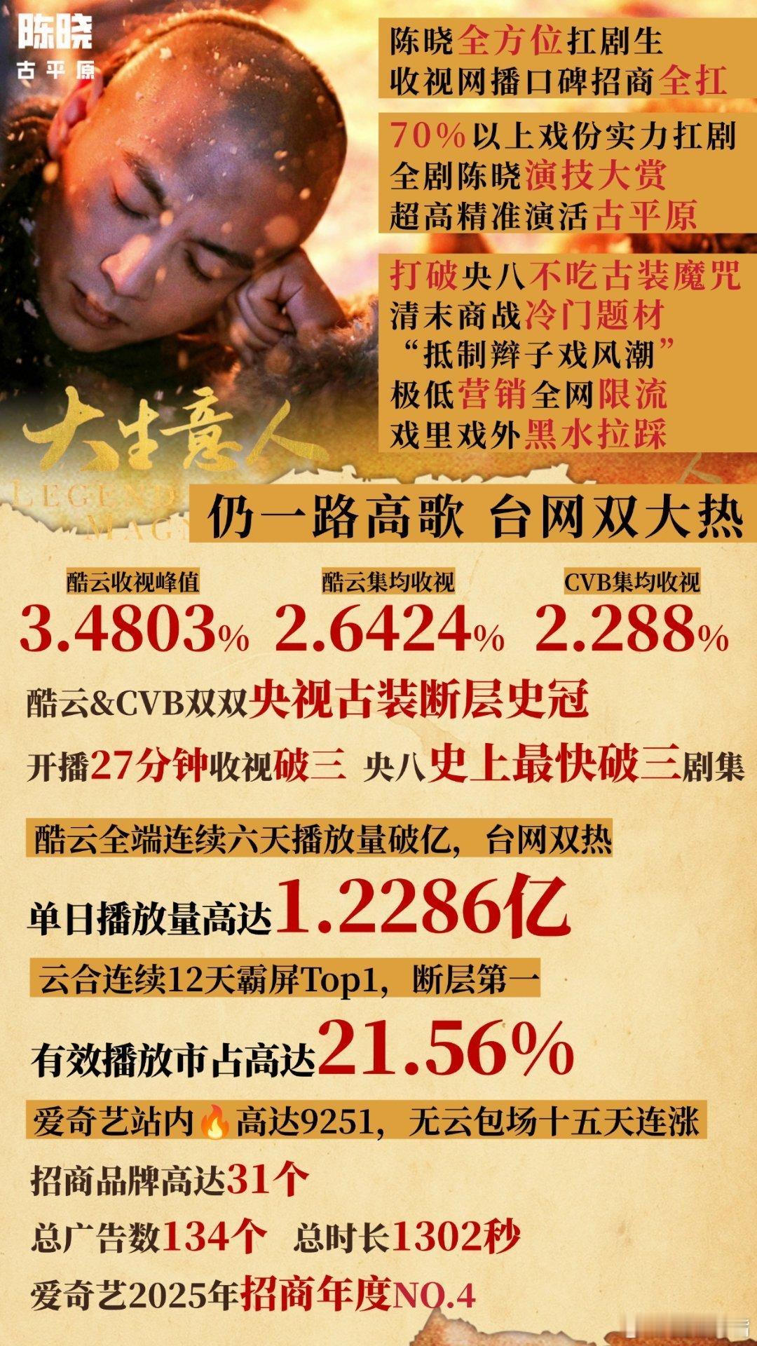 大生意人 陈晓全方位扛剧生,收视网播招商口碑全网无短板!《大生意人》打破央八不吃古装魔咒,用清末商战冷门题材,在“抵制辫子戏风潮”下,全网极低营销限流下,一路高歌,台网双热,打破央八最快破三记录,拿下央视酷云cvb古装史冠,不分题材,不分赛道,陈晓剧粉盘稳稳发挥,数据仅部分整理,就这个多榜归一爽!
