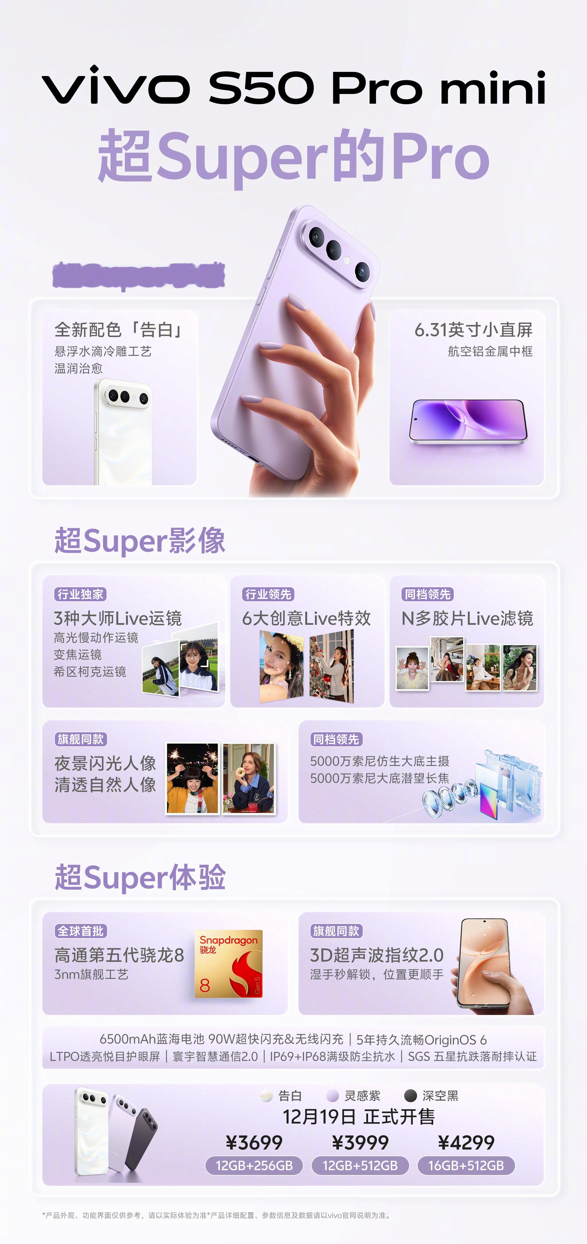 vivo S50系列发布会总结vivo S50(标准版)均衡能打,颜值实力双在线配置:6.59英寸直屏,航空铝金属中框+缎面柔光玻璃背板,配色含告白、灵感紫、悠悠蓝、深空黑;高通骁龙8S第三代,LPDDR5X内存+UFS4.1存储;6500mAh电池+90W快充;索尼IMX882潜望长焦(支持10倍变焦),大师Live运镜(高光慢动作、变焦、希区柯克),胶片滤镜,Live路人消除;3D超声波指纹2.0,IP68+IP69防尘抗水,X轴线性马达,立体声双扬声器,OriginOS 6系统。价格:12GB+256GB 2999元12GB+512GB 3299元16GB+256GB 3399元16GB+512GB 3599元————————————vivo S50 Pro mini小屏旗舰,性能影像双越级配置:6.31英寸小直屏,航空铝金属中框+缎面柔光玻璃背板,配色含告白、灵感紫、深空黑;高通骁龙8第五代,LPDDR5X Ultra内存+UFS4.1存储;6500mAh电池+90W有线快充+40W无线闪充;索尼IMX921主摄+索尼IMX882潜望长焦(支持10倍变焦),全焦段变焦闪光灯,大师Live运镜,胶片滤镜,Live路人消除;3D超声波指纹2.0,IP68+IP69防尘抗水,X轴线性马达,立体声双扬声器,OriginOS 6系统。价格:12GB+256GB 3699元12GB+512GB 3999元16GB+512GB 4299元