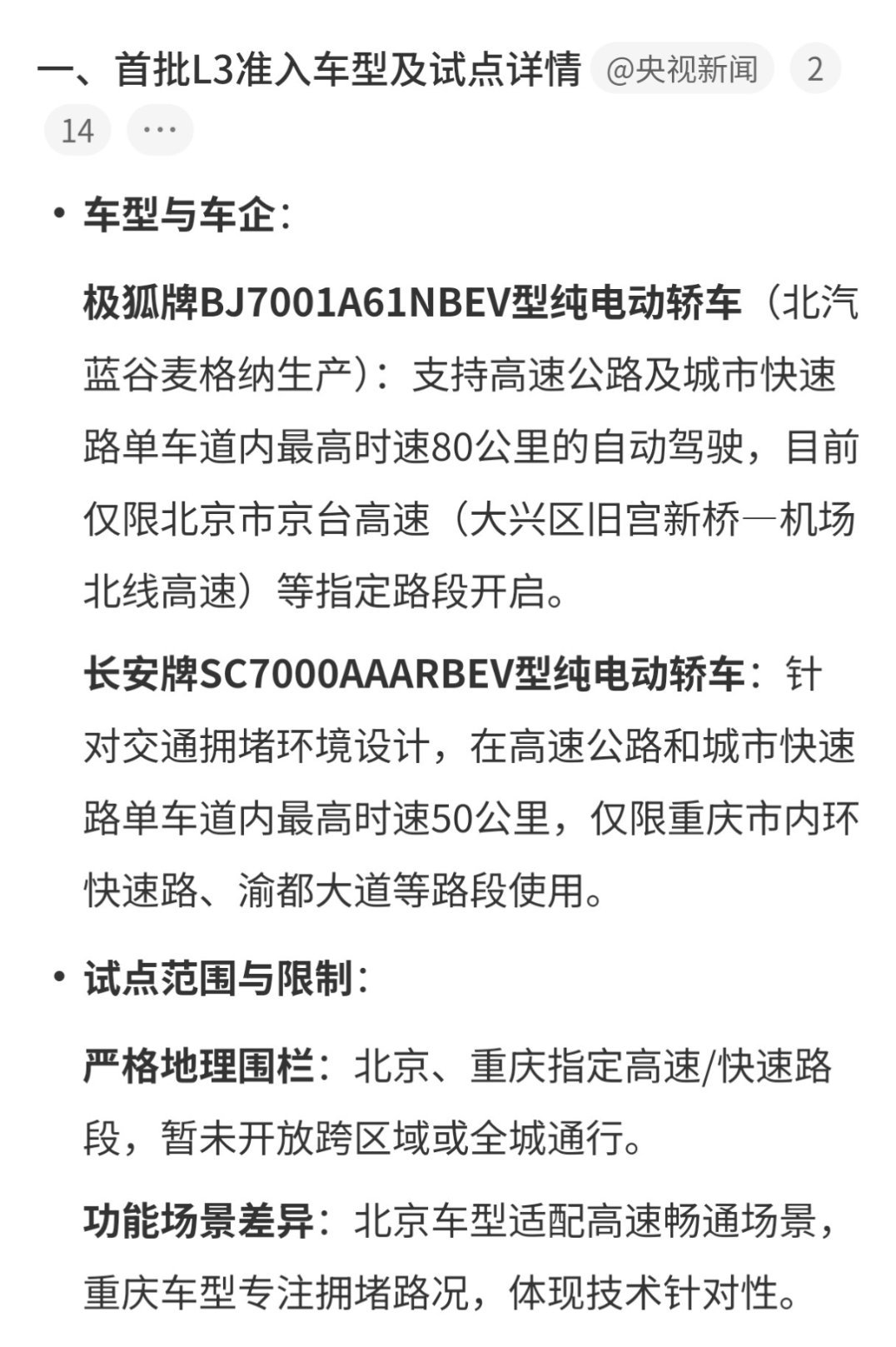 我国首批L3自动驾驶车型获准入许可北京和重庆,一南一北,接下来就是上路通行试点了