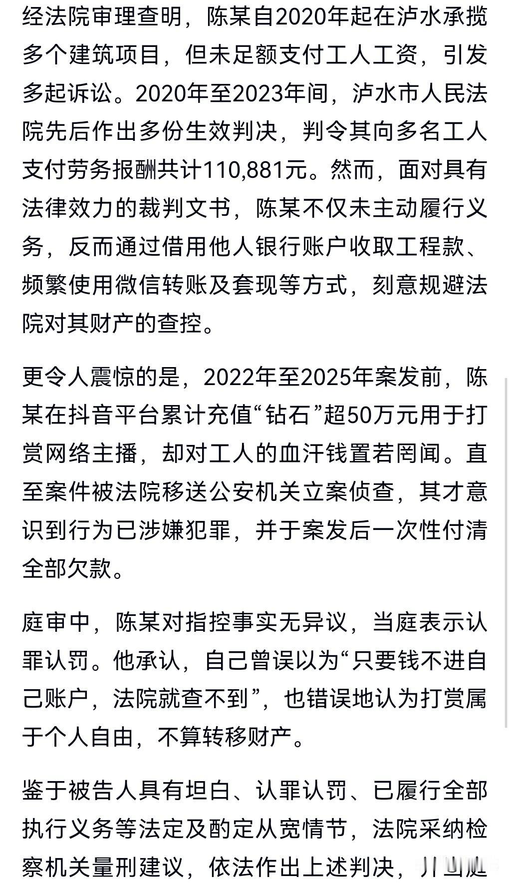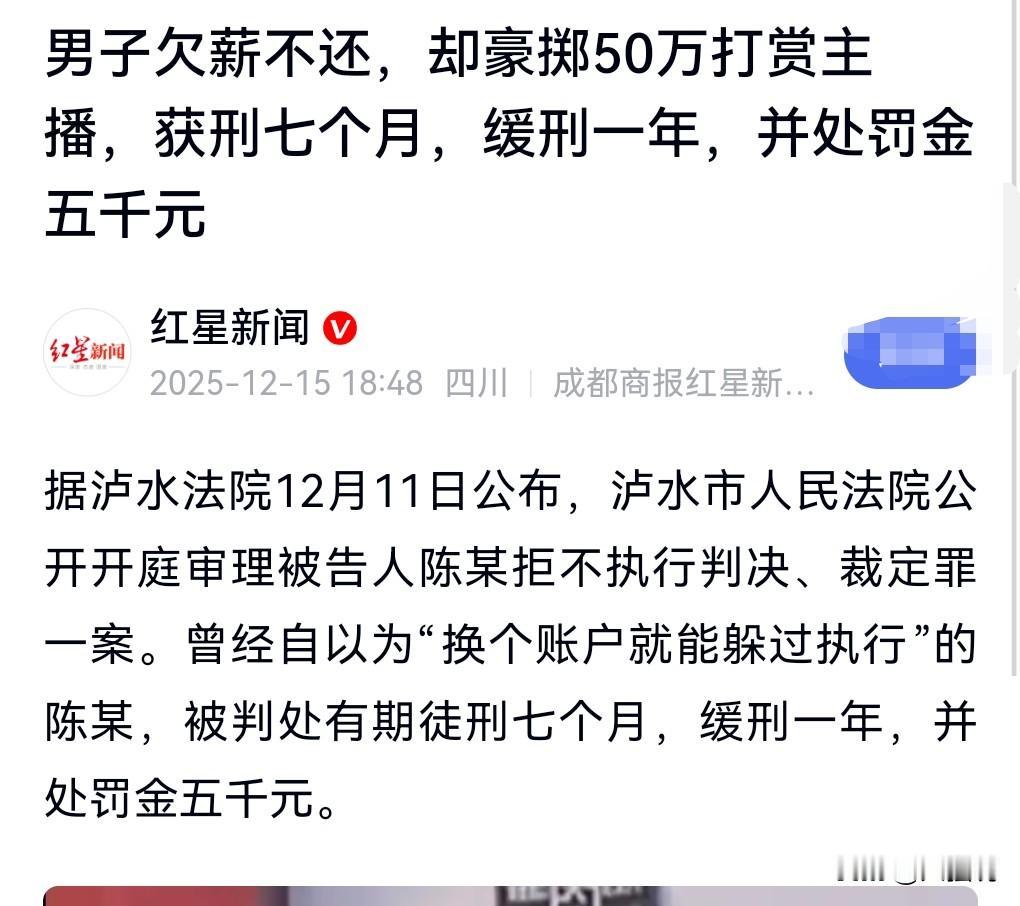 老赖可真的是太可恶了,有钱不还太可恶了。 男子欠薪不还却豪掷50万打赏主播。 欠工人的钱不还,没想到这样花50万打赏主播。 这真的是太恶劣了。 这种人不让他坐牢,他就不知道错。 男子被判有期徒刑7个月,缓刑一年。