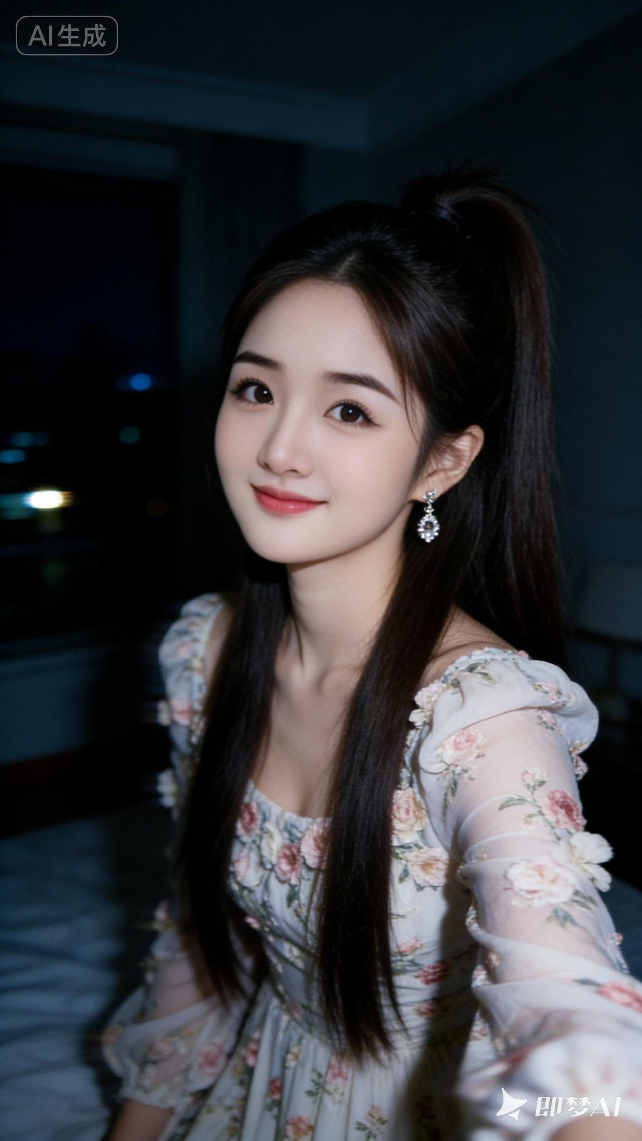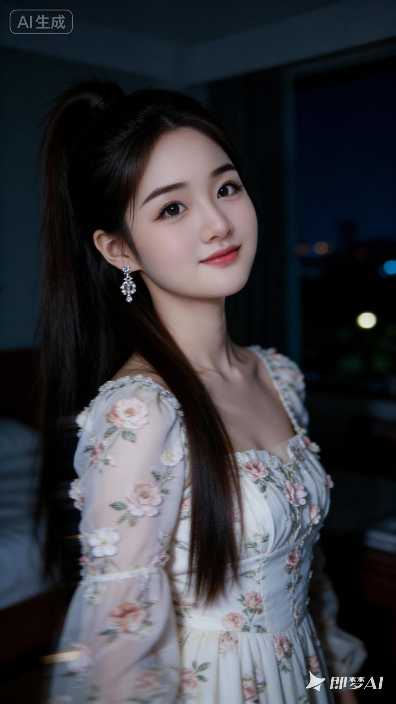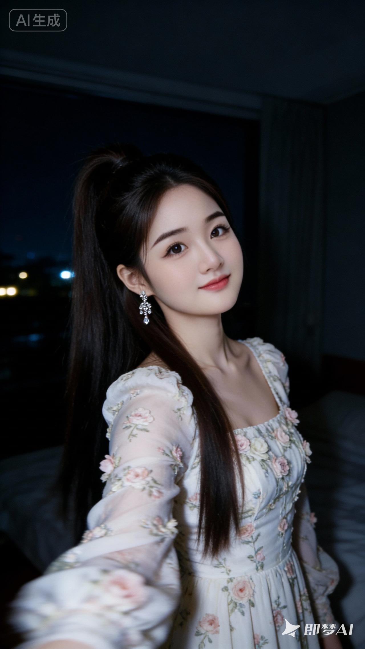 一张高清人像摄影照片,主体是一位20多岁的东亚美女,乌黑长发柔顺有光泽,妆容精致