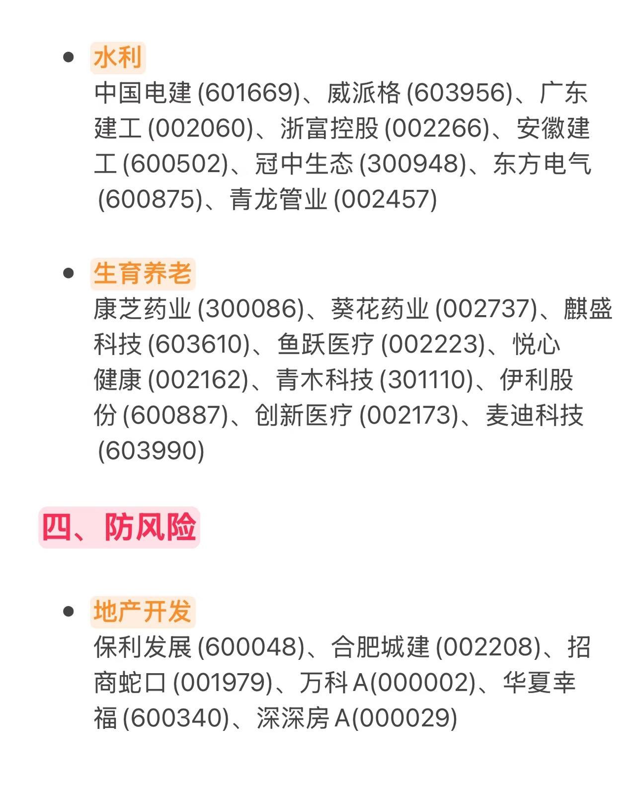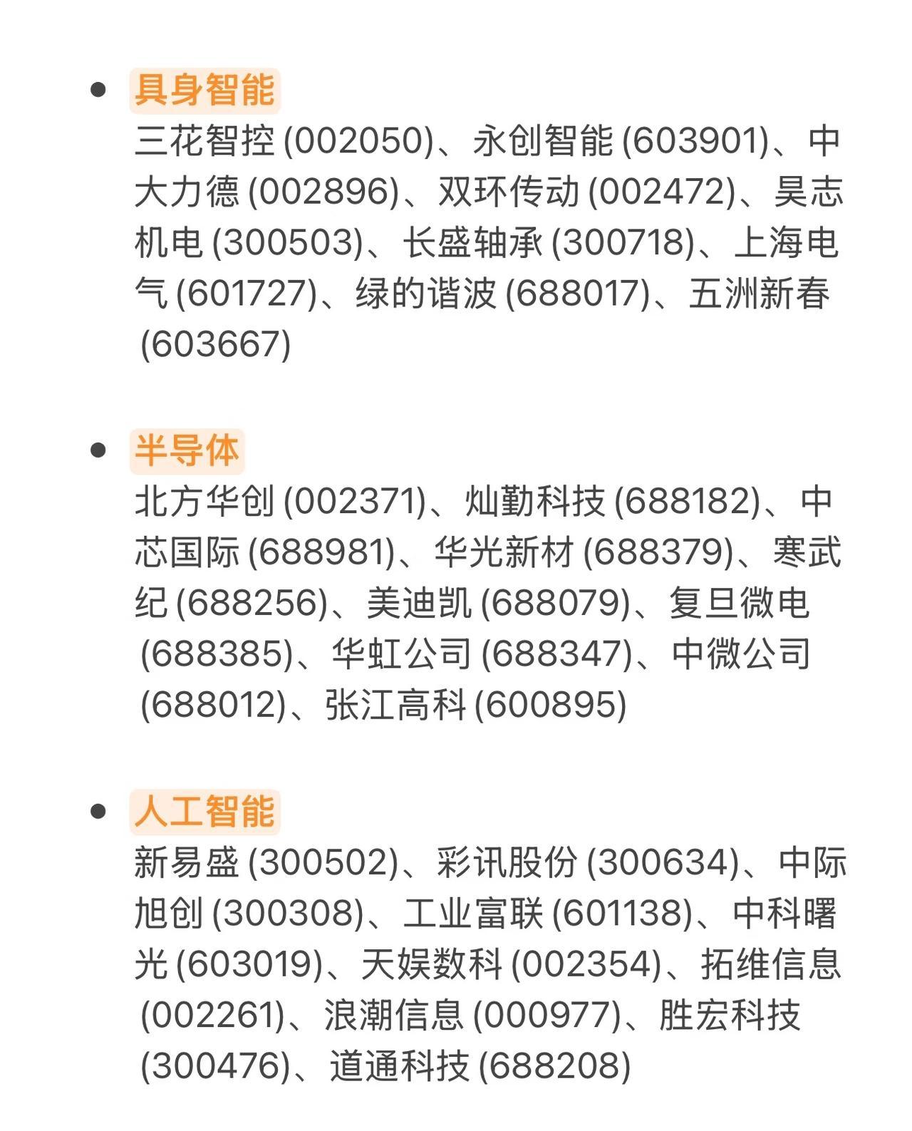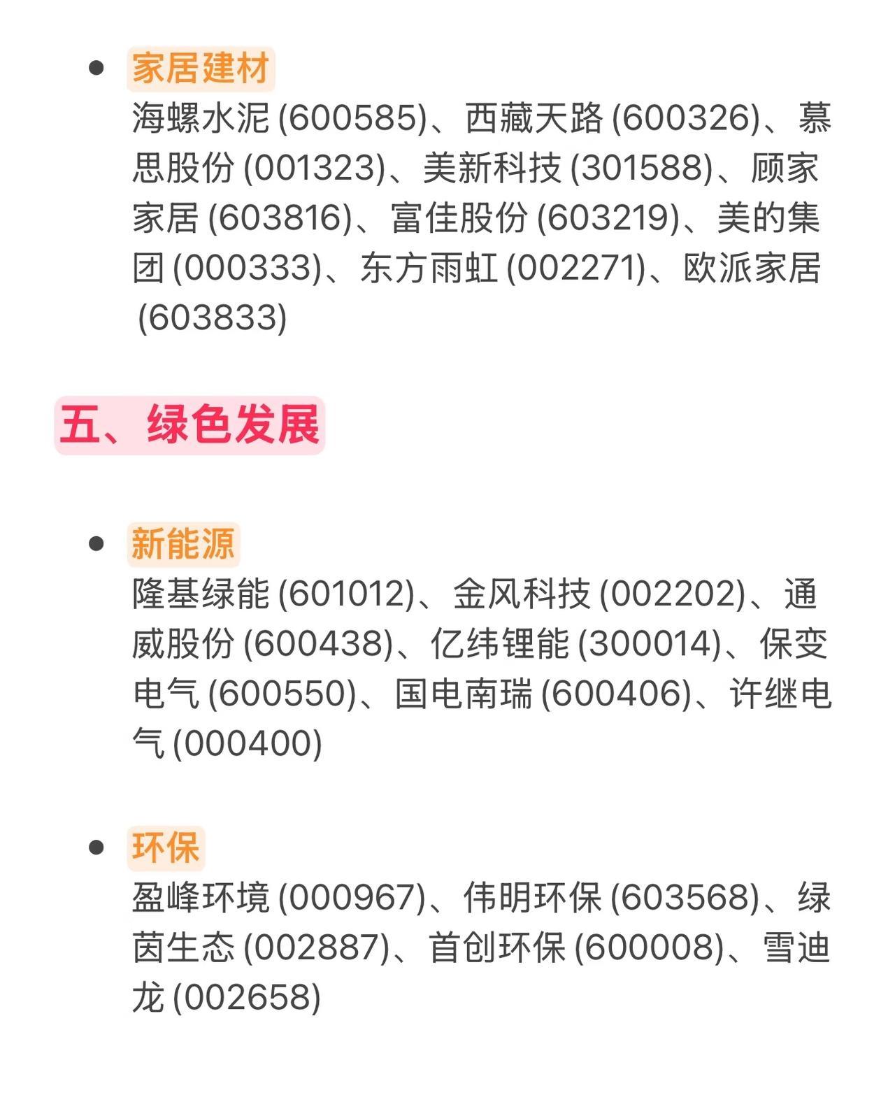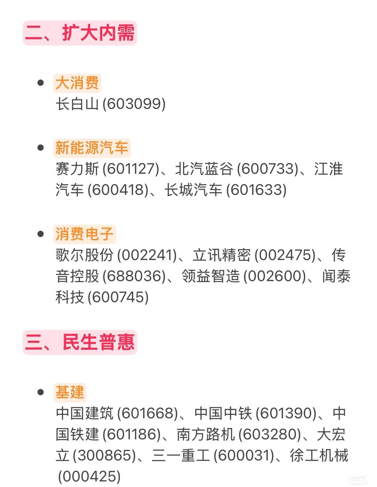 经济工作会议相关内容围绕五大核心方向展开,涵盖科技创新、扩大内需、民生普惠、防风险及绿色发展,各领域均列出相关重点企业及股票代码:一、科技创新:聚焦量子科技、商业航天、氢能/核聚变三大领域。量子科技涉及国盾量子(688027)、中国长城(000066)等8家企业;商业航天包括航天发展(000547)、航天科技(000901)等8家企业;氢能/核聚变覆盖蓝科高新(601798)、中国核电(601985)等8家企业。二、扩大内需:包含大消费、新能源汽车、消费电子三方面。大消费仅长白山(603099);新能源汽车有赛力斯(601127)、北汽蓝谷(600733)等4家车企;消费电子含歌尔股份(002241)、立讯精密(002475)等5家企业。三、民生普惠:主要涉及基建领域,包括中国建筑(601668)、中国中铁(601390)、中国铁建(601186)等7家企业。四、防风险:涵盖水利、生育养老、地产开发三类。水利有中国电建(601669)、威派格(603956)等8家企业;生育养老包括康芝药业(300086)、葵花药业(002737)等9家企业;地产开发涉及保利发展(600048)、招商蛇口(001979)、万科A(000002)等6家企业。五、绿色发展:分为家居建材、新能源、环保三部分。家居建材含海螺水泥(600585)、西藏天路(600326)等9家企业;新能源包括隆基绿能(601012)、金风科技(002202)等7家企业;环保覆盖盈峰环境(000967)、伟明环保(603568)等5家企业。