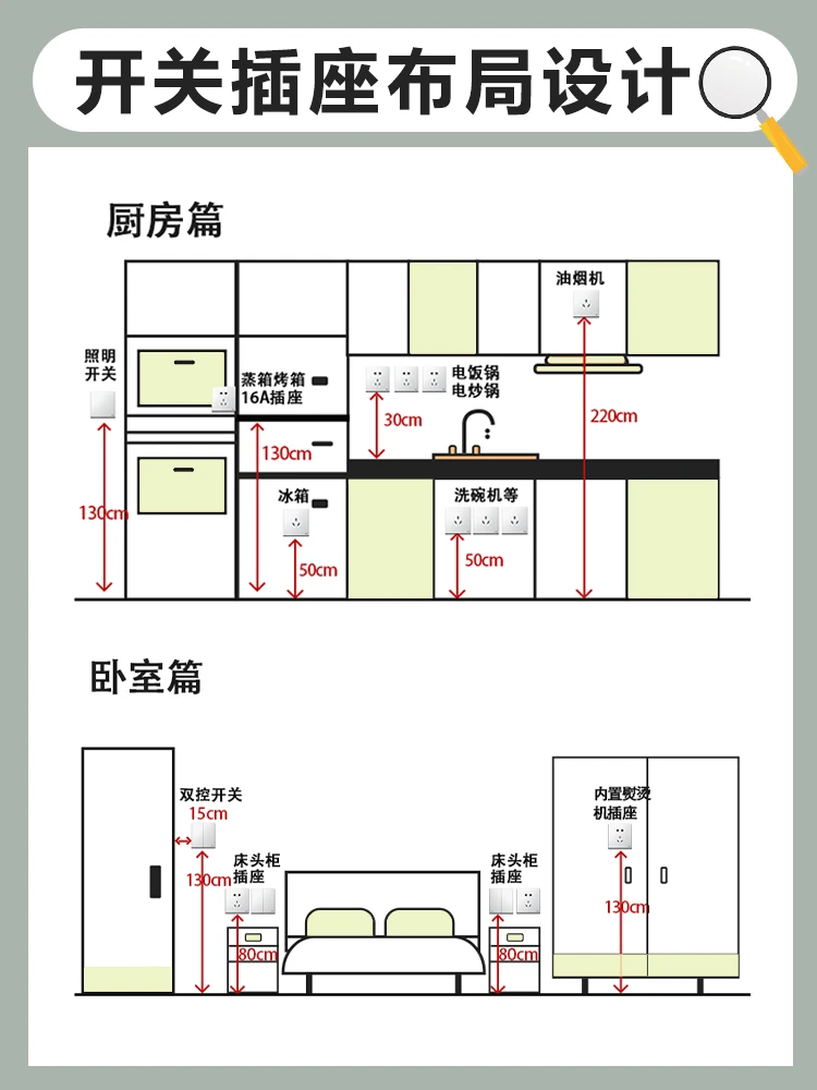 ✔️厨房照明开关:同样是单控开关就够用,高度在离地面1.2-1.5m之间,便于触及地方就可以。