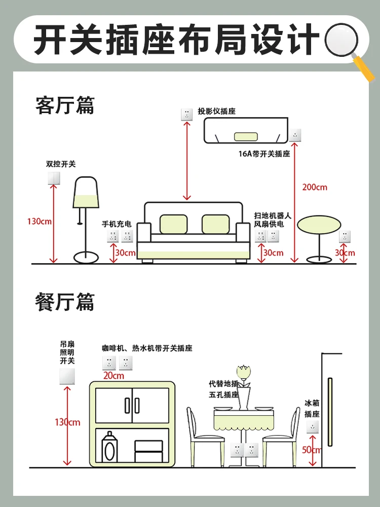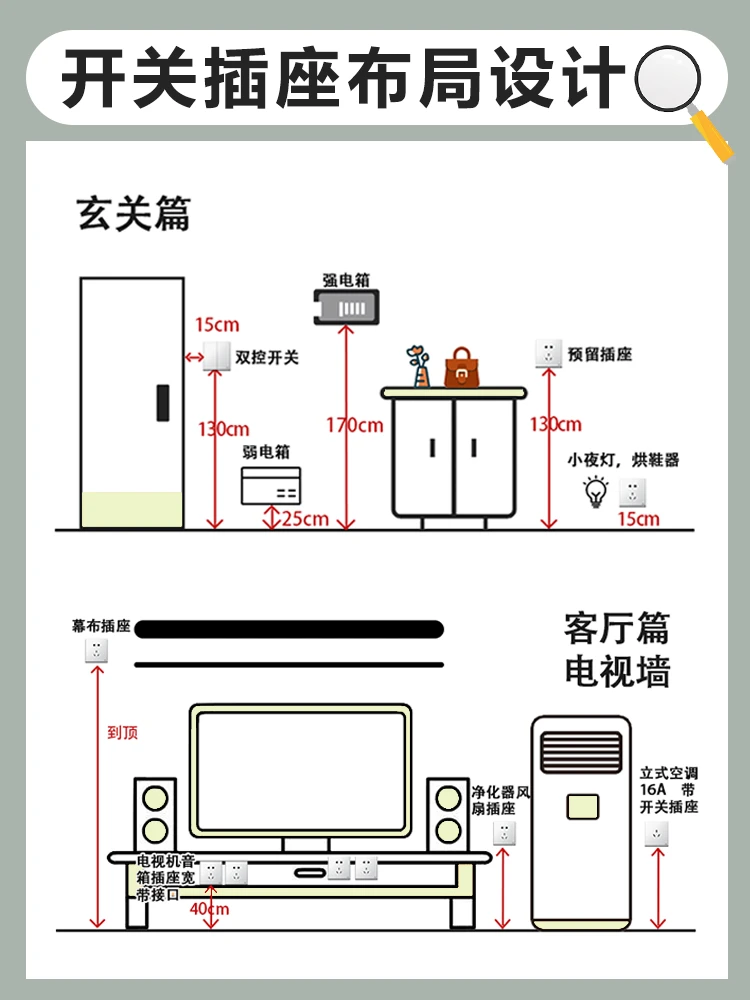 建议选用双控开关,在其他地方也能控制客厅照明,高度预留范围在1.2-1.5m之间。