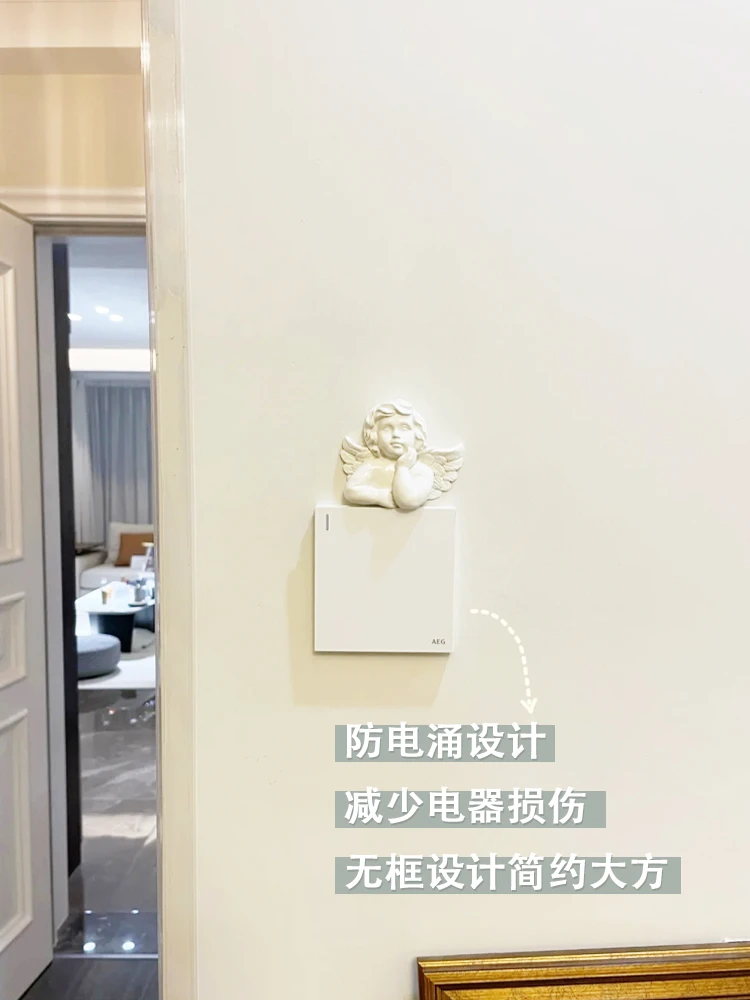 🤗我家新房装修预留不了不少开关插座,现在还没出现不够用的情形,入手的也是和好多朋友家一样的AEG开关插座👉🏻它是德国的牌子,品质有保证,毕竟关乎电的安全很重要,它有安全保护门,如果有小宝宝也不怕他把手放进去触电啦。👏👏另外无框设计,看上去简约大方,到现在都没有发黄,颜色还是跟蕞开始一样。听说它有防电涌设计,可以减少对电器的损害,我最喜欢这个功能了,因为家里的智能电器有很多‼️