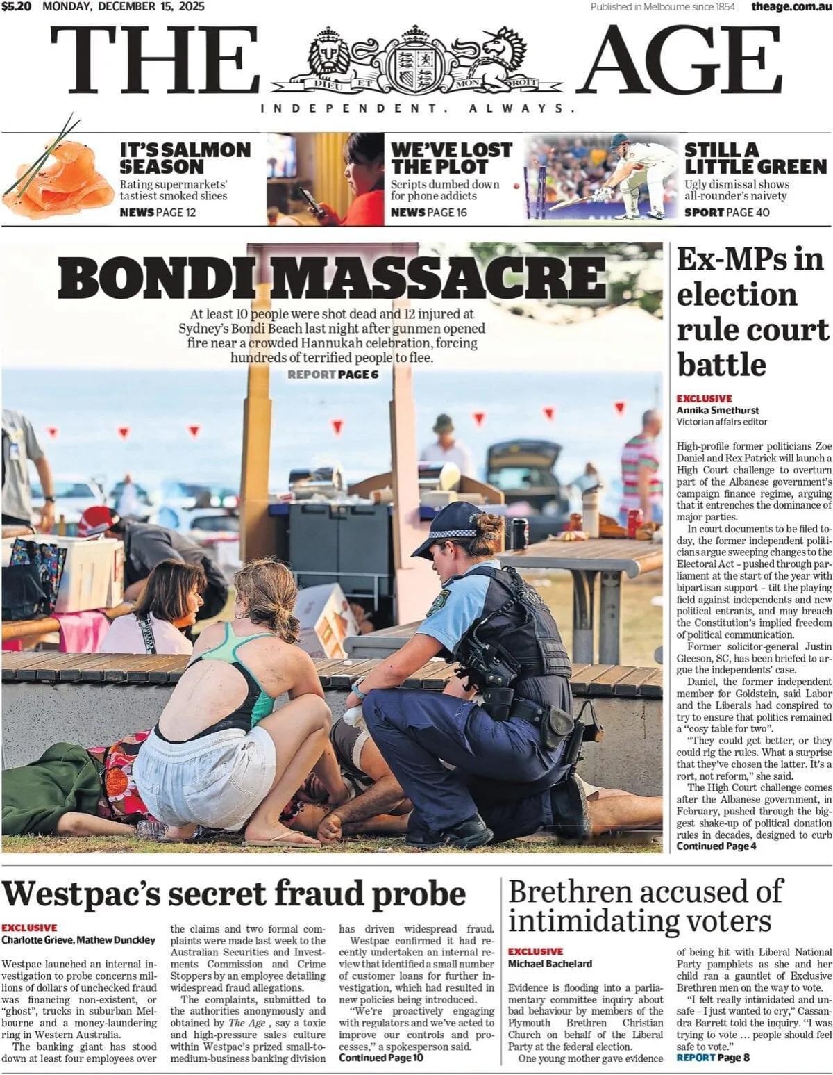 澳大利亚《时代报》头版报道称,澳大利亚“黄金”海岸-邦迪海滩大惨案。 昨晚,在悉尼的邦迪海滩,枪手在一场拥挤的犹太人光明节庆祝活动附近开枪,造成至少10余人死亡,12人受伤,数百名惊恐的民众被迫逃离。