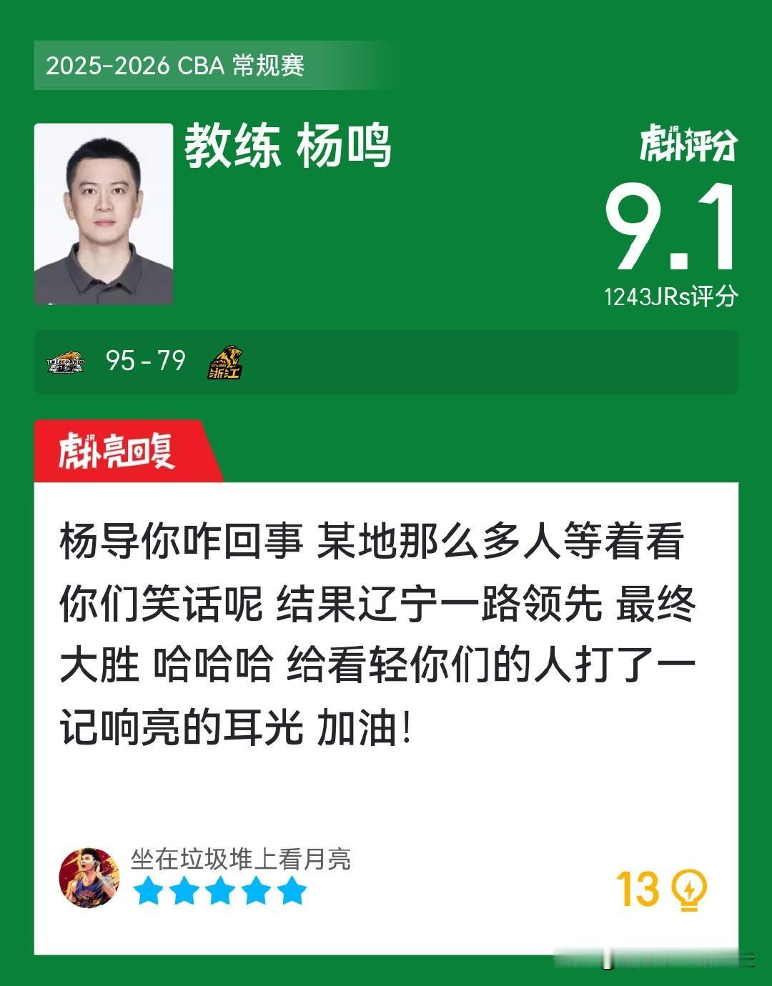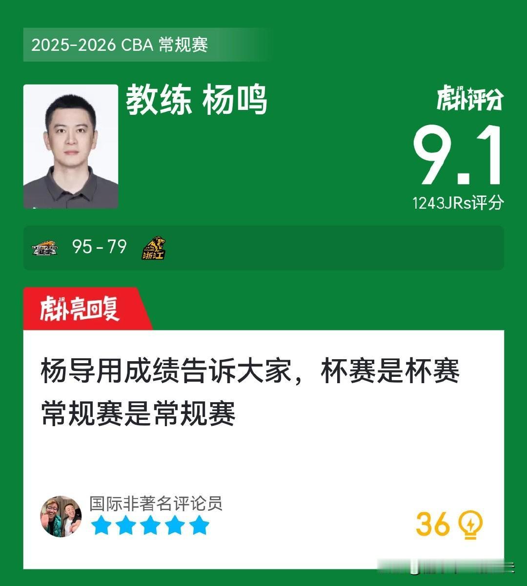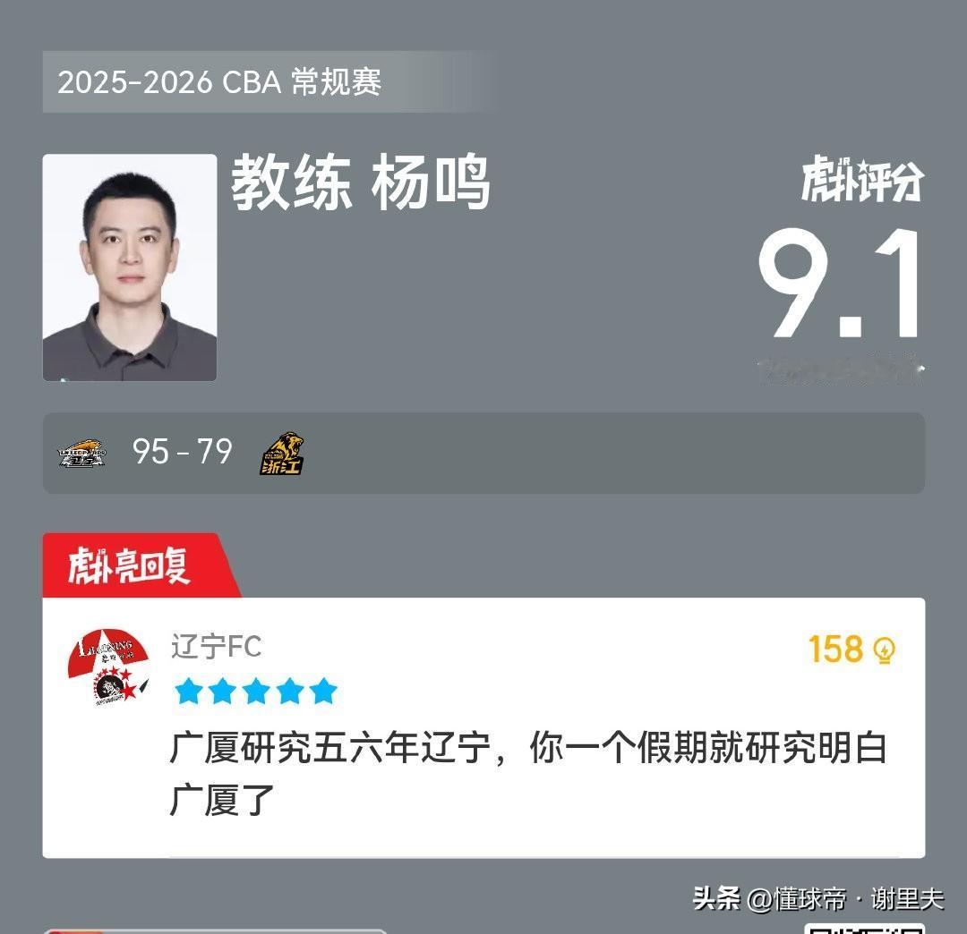杨鸣打一巴掌,给个甜枣。换人后场下特殊关照俞泽辰:“三步都运起来了,还传什么球,下次就直接往里扣”!最后还不忘来一次势大力沉的击掌鼓励,这就是杨鸣作为王朝球队主帅的“御人之道”,杨鸣带队用行动表明,杯赛是杯赛,联赛是联赛,谁也不敢低估辽宁队!年轻球员有试错空间,但学费必须交的值,杨鸣言传身教不愧是蒋兴权的关门弟子。