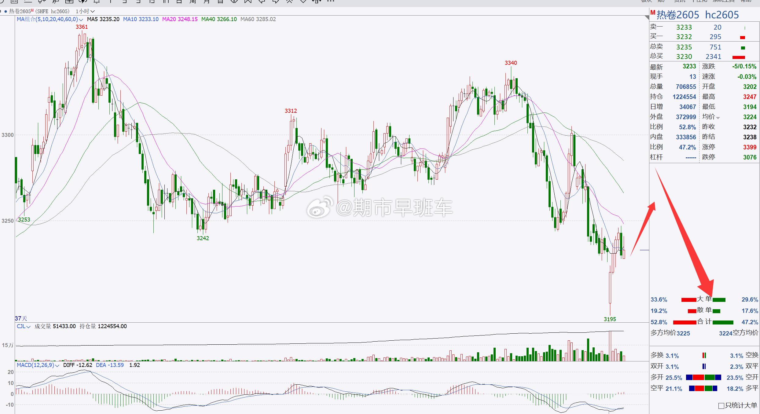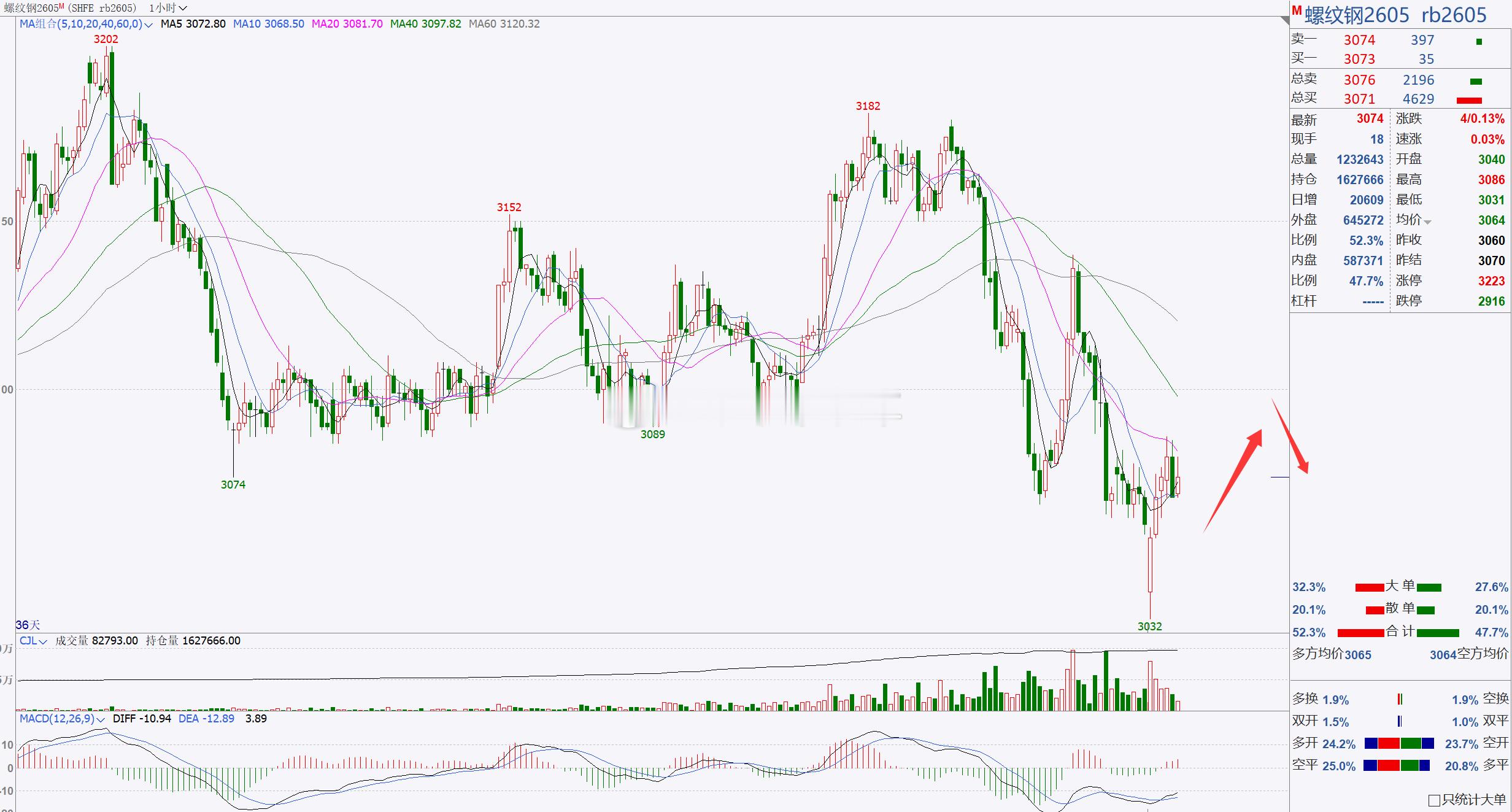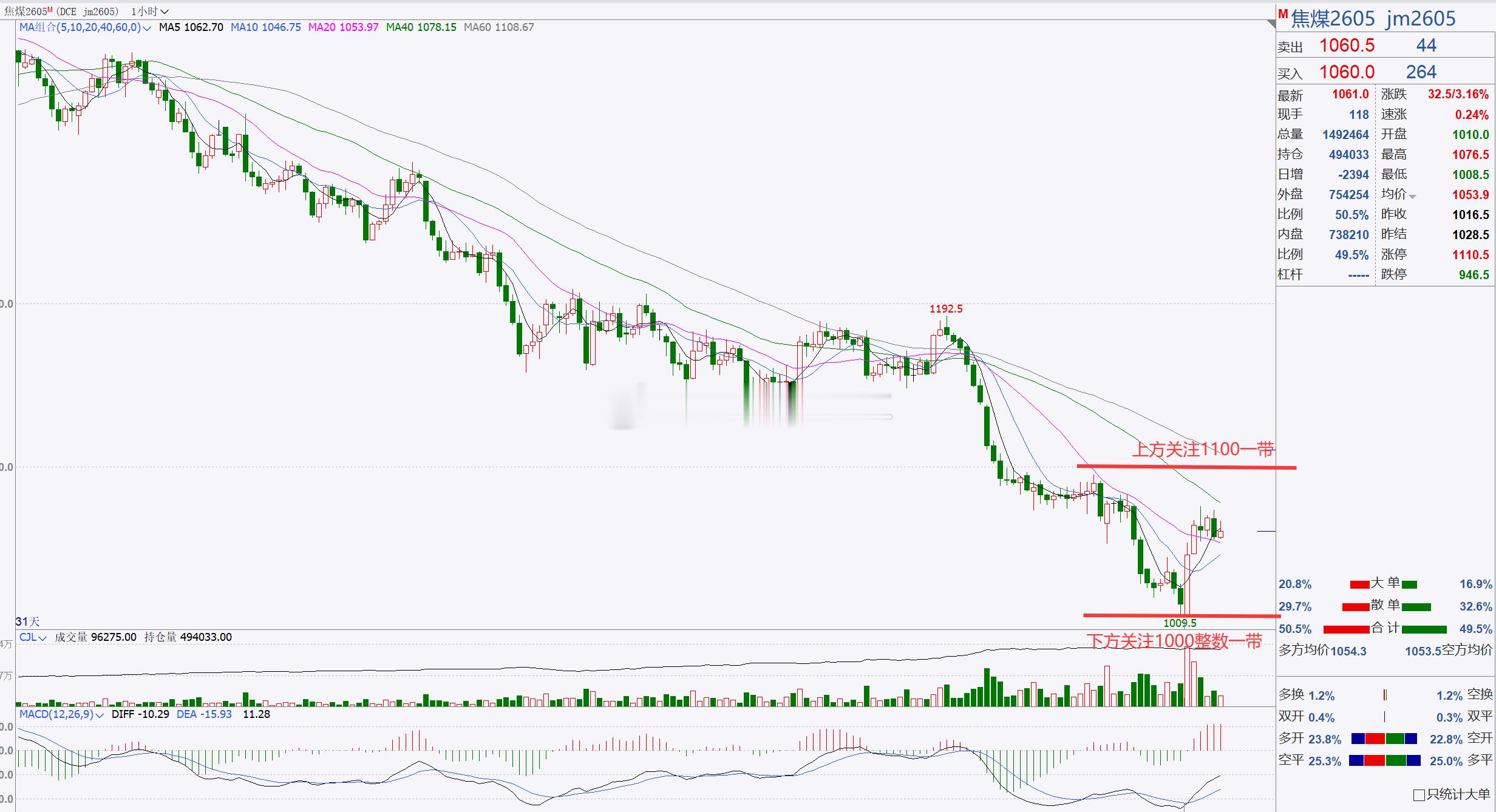 1、【焦煤2605】焦煤关注1100一带,短线跟进!焦煤日内反弹调整,目前来看行情未能延续,后市我们重点关注1100一带,若此位置未能突破站稳,建议短线跟进,看横盘调整,稳健者建议先观望;例如空关注1085—1095附近,下方先关注1020附近;多关注1020附近再择机考虑介入;(建议仅供参考,具体操作以开盘点位实时跟进,据此操作风险自担)2、【螺纹2605】螺纹短线跟进,看横盘调整!螺纹日内探底回升,目前来看处于低位横盘,后市建议短线跟进,重点关注3100一带;例如多关注3050附近,上方先关注3120附近;空关注3120突破情况再择机考虑介入;(建议仅供参考,具体操作以开盘点位实时跟进,据此操作风险自担)3、【热卷2605】热卷短线跟进!热卷日内伴随着探底回升,整体行情依旧偏弱,后市我们重点关注3200一带,若此位置站稳,未能跌破,建议短线跟进即可;例如多关注3210—3200附近,上方关注3280—3290附近;空关注3290突破情况再择机考虑介入;(建议仅供参考,具体操作以开盘点位实时跟进,据此操作风险自担)4、【铁矿石2605】铁矿石偏空!铁矿石日内延续走回踩,整体行情依旧偏弱,后市建议短期偏空跟进,但不过多看空间,重点关注前夕734低点;例如空关注760—762附近,下方先关注740附近;多关注740跌破情况再择机考虑介入;(建议仅供参考,具体操作以开盘点位实时跟进,据此操作风险自担)焦煤 焦煤 螺纹 热卷 铁矿石