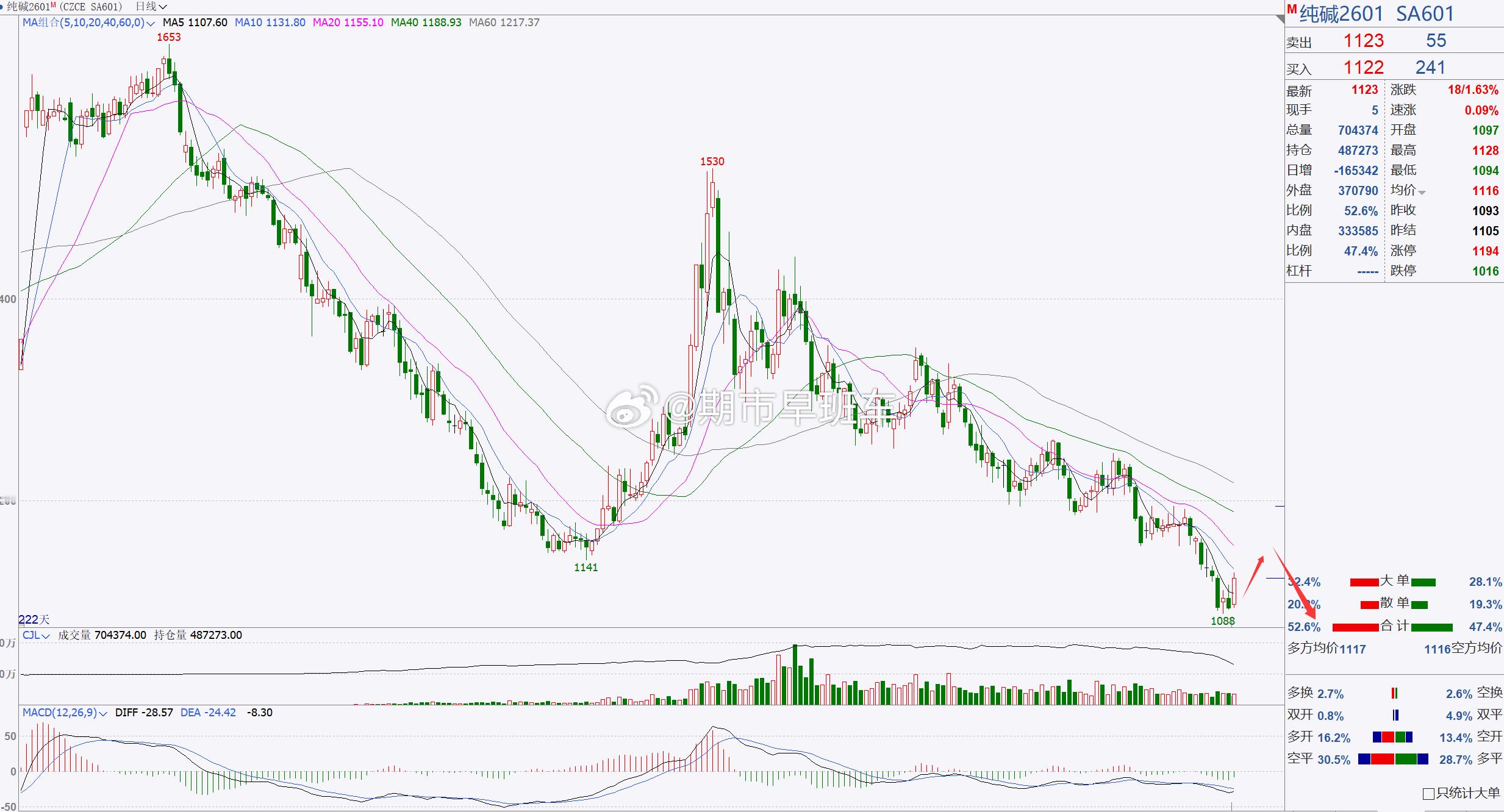 【纯碱2601】纯碱短线跟进!纯碱日内伴随着反弹调整,但是整体行情依旧偏弱,后市我们关注1100一带,若此位置企稳,可看短期反弹调整,但不过分看空间,建议短线跟进即可;例如多关注1110—1100附近,上方先关注1150附近;空关注1150突破情况再择机考虑介入;(建议仅供参考,具体操作以开盘点位实时跟进,据此操作风险自担)纯碱 玻璃