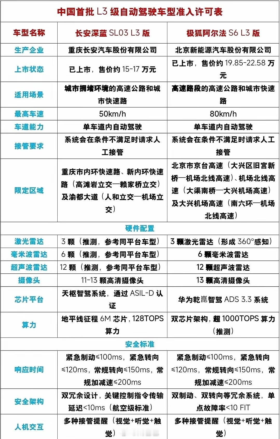 我国首批L3自动驾驶车型获准入许可南北车企分别是谁?看车型 分别是长安深蓝SL03与极狐阿尔法S6重庆版:重庆市内环快速路、新内环快速路(高滩岩立交—赖家桥立交)、渝都大道(人和立交—机场立交)北京版:北京市京台高速、机场北线高速、大兴机场高速指定看限定区域:重庆偏城市立交日常通勤,北京偏高速场景。都是非常实用的日常驾驶场景。此外这两款车基本都是20万以下车型,L3并不会让大家遥不可及,总之L3离我们越来越近了。