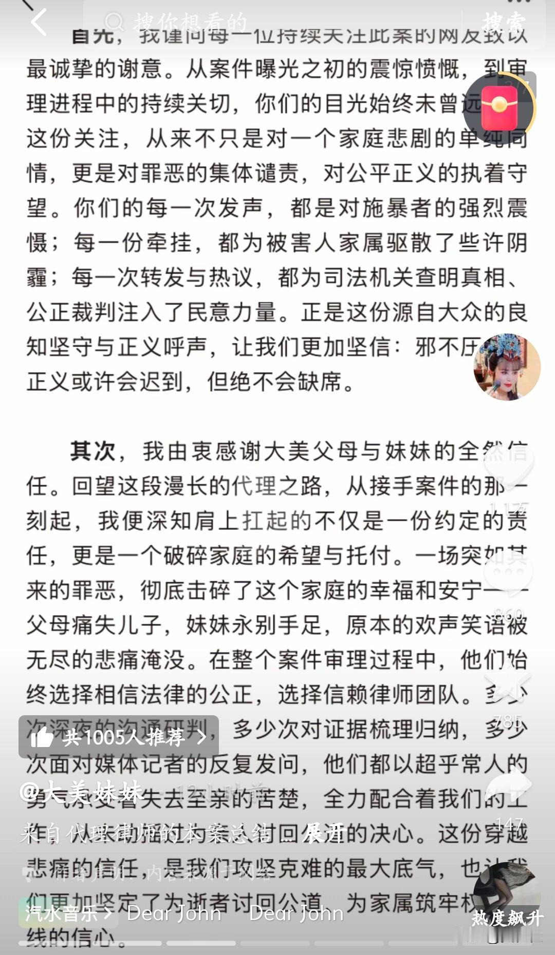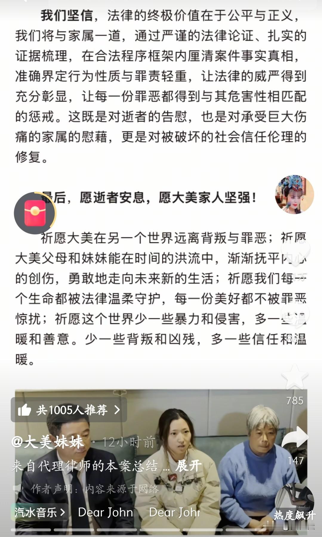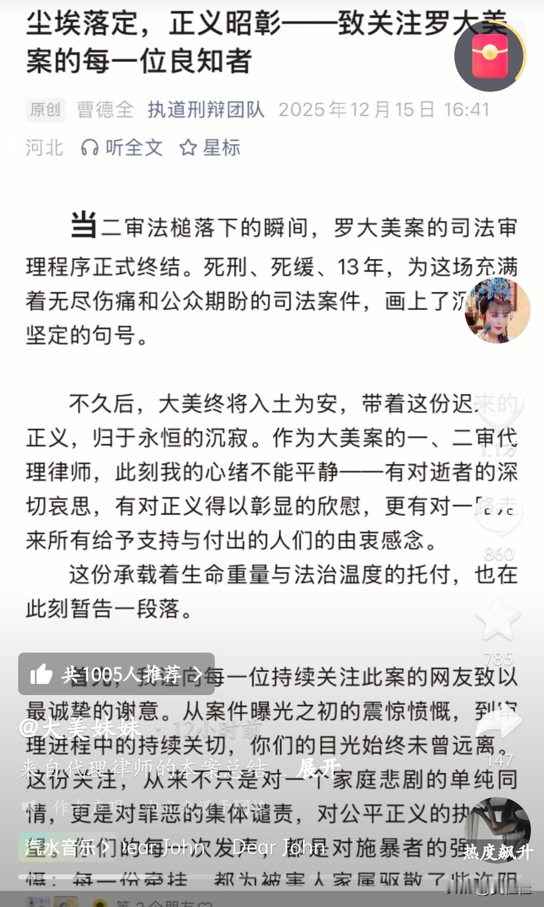 罗大美的妹妹更新动态了,发的是代理律师曹律师对案子的总结。二审审理结束,罗大美案的司法流程算是落定了,涉案人员分别被判处极刑、缓期执行、13年有期徒刑,迟来的公道总算有了眉目。 可家属心里还是难以接受,尤其是杨某仅获13年刑期,家属认为其是案件关键人物,这个判决与其行为的恶劣程度不匹配,律师也表示会支持家属继续通过合法途径维权。 这一路,家属忍着失去亲人的悲痛,始终相信法律的公正,相关司法部门也为查清事实付出了努力。只是案子结了,失去亲人的伤痛却挥之不去,希望后续能有更合理的结果,也愿大美能安息,家人能慢慢走出阴霾。