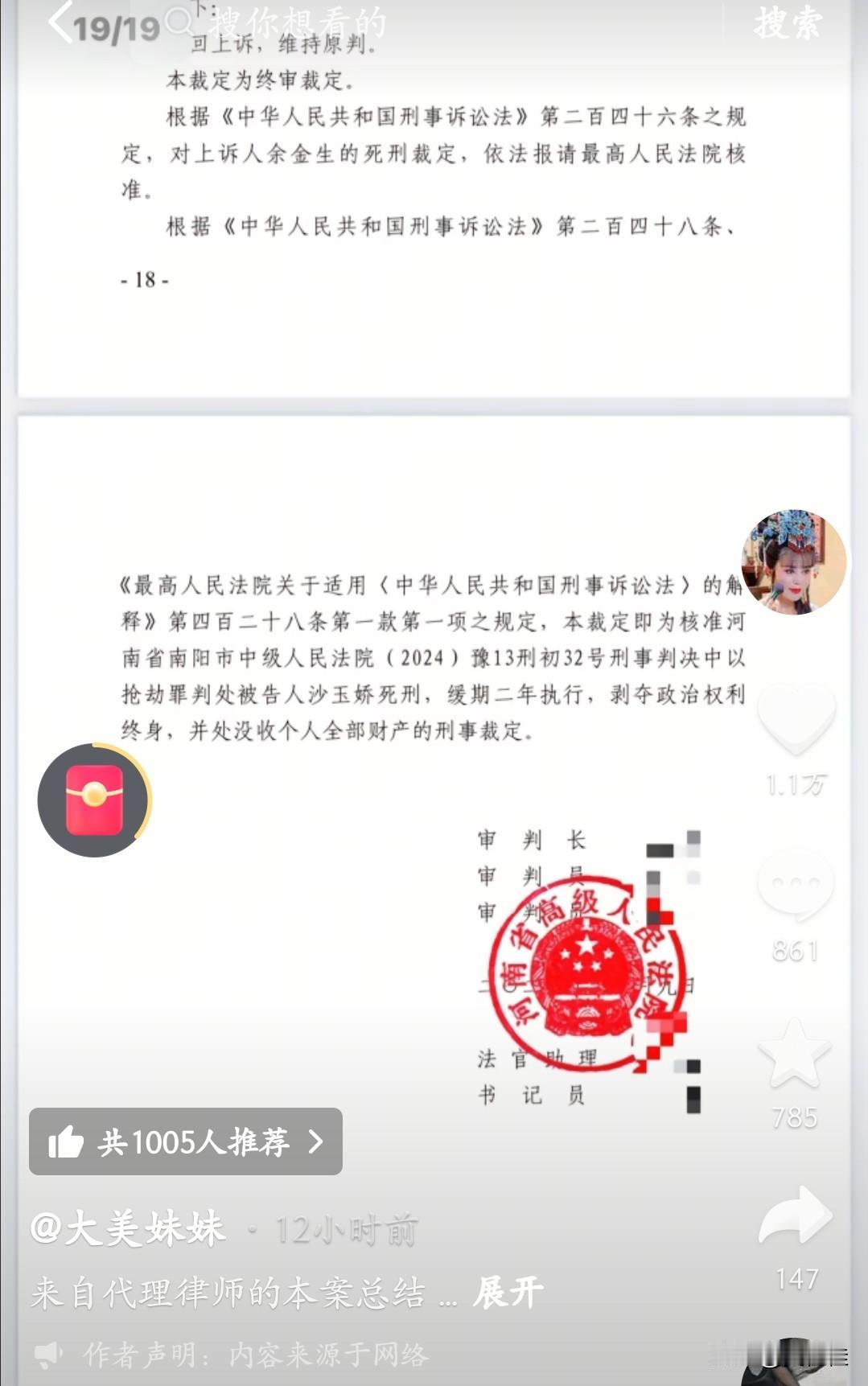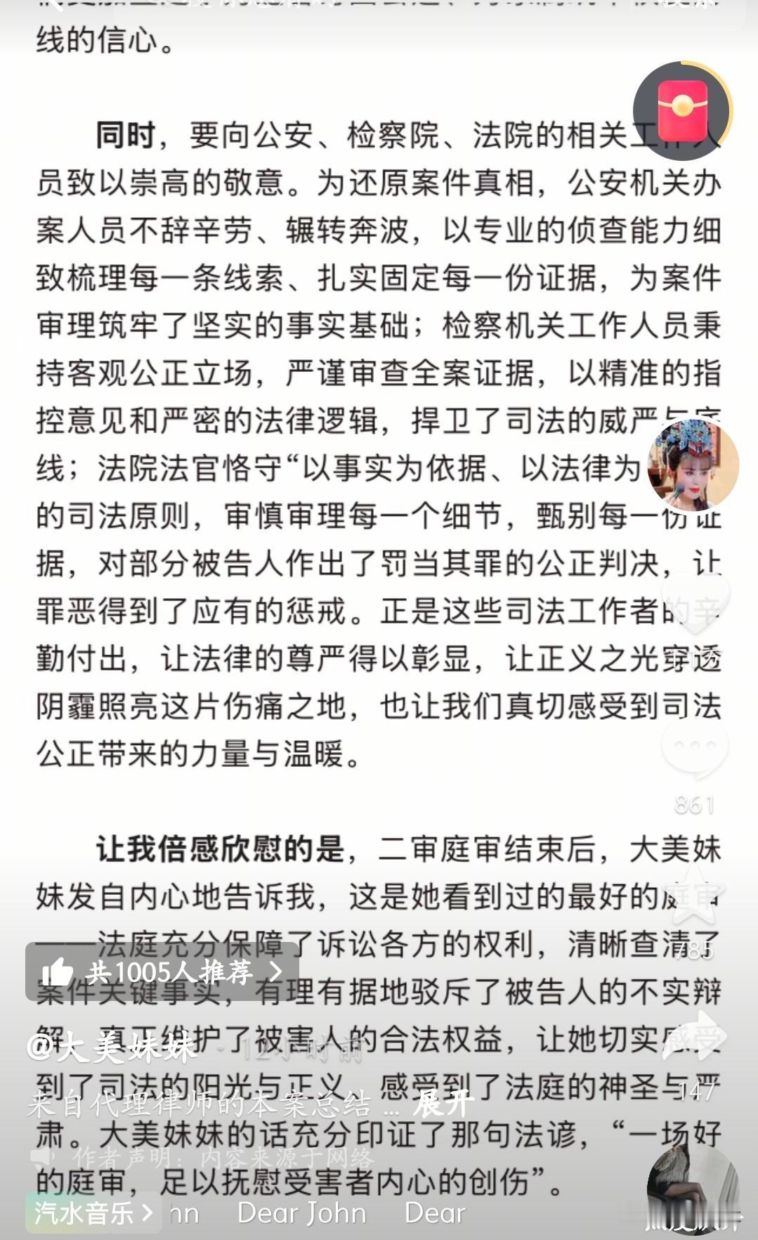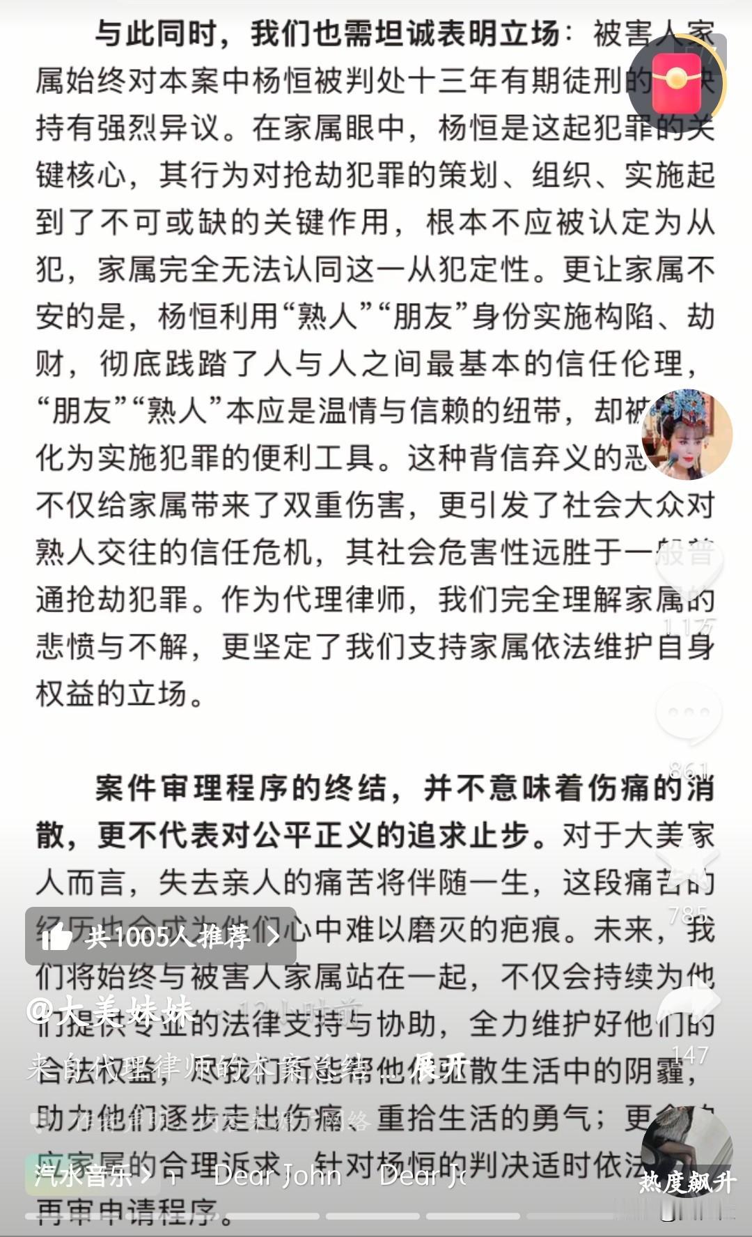 罗大美的妹妹更新动态了,发的是代理律师曹律师对案子的总结。二审审理结束,罗大美案的司法流程算是落定了,涉案人员分别被判处极刑、缓期执行、13年有期徒刑,迟来的公道总算有了眉目。 可家属心里还是难以接受,尤其是杨某仅获13年刑期,家属认为其是案件关键人物,这个判决与其行为的恶劣程度不匹配,律师也表示会支持家属继续通过合法途径维权。 这一路,家属忍着失去亲人的悲痛,始终相信法律的公正,相关司法部门也为查清事实付出了努力。只是案子结了,失去亲人的伤痛却挥之不去,希望后续能有更合理的结果,也愿大美能安息,家人能慢慢走出阴霾。