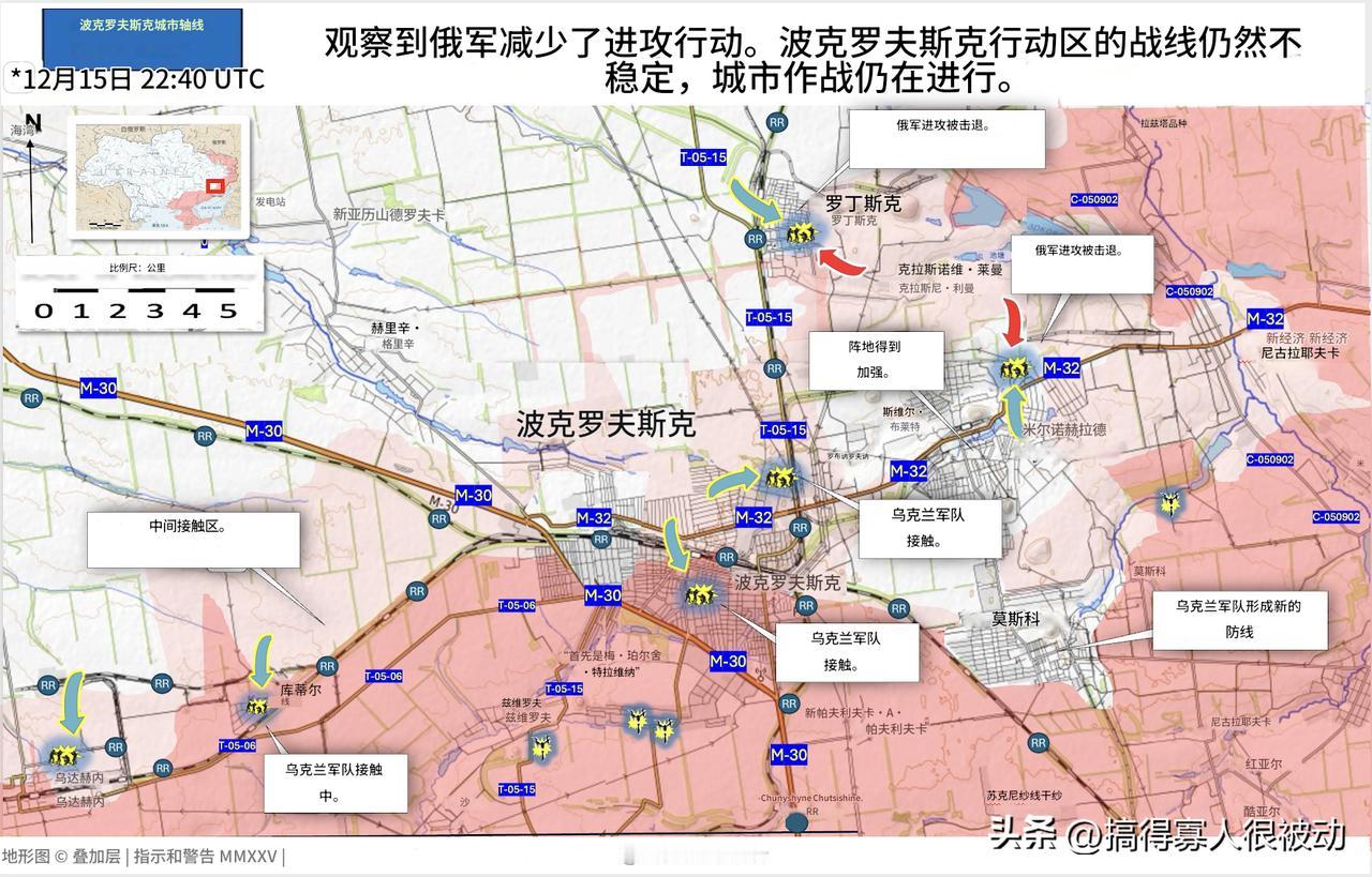 波克罗夫斯克:在过去24小时,俄军进攻节奏明显放缓,从频繁的机械化侦察转向零星的小队渗透和静态交战。 地理定位录像显示袭击事件较少。 战线呈犬牙交错的状态,乌军收复波克罗夫斯克铁路线以南部分区域,俄军正试图包围米诺尔赫拉德。