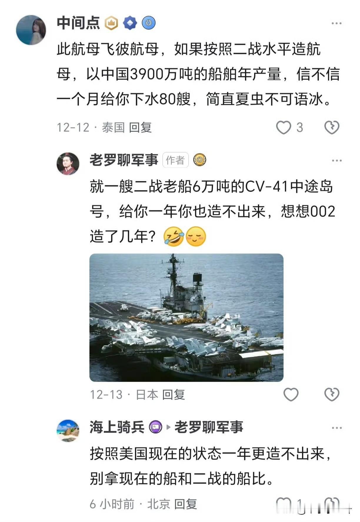 美国二战期间完工了18艘“埃塞克斯”级航母吧,我记得,其他那些“卡萨布兰卡”级什么的基本上就是货轮。 二战时的航母别说导弹了,连雷达都没有,侦查敌舰完全靠侦察机碰运气,和现在的航母完全就是两回事儿 而且 按照二战标准,大型汽车滚装船(PCTC)直接就能做航母吧。按照手持订单推算,今年交付69艘,明年交付59艘。算一下平均每个月造多少艘航母?[吃瓜群众]航母发展史 美国航母舰