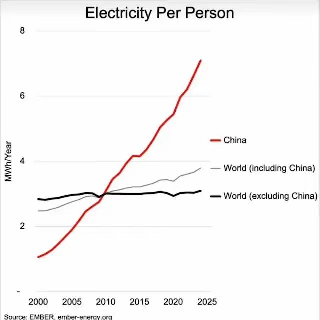 年均用电量在很大程度上反映了一个国家的发展水平。 中国人年均用电量从2000年的约1.5兆瓦时/年迅速增长至2025年的约7兆瓦时/年,如今已经远超国际水平。 从这个数据来看,其实比GDP更能反映中国的发展状况。