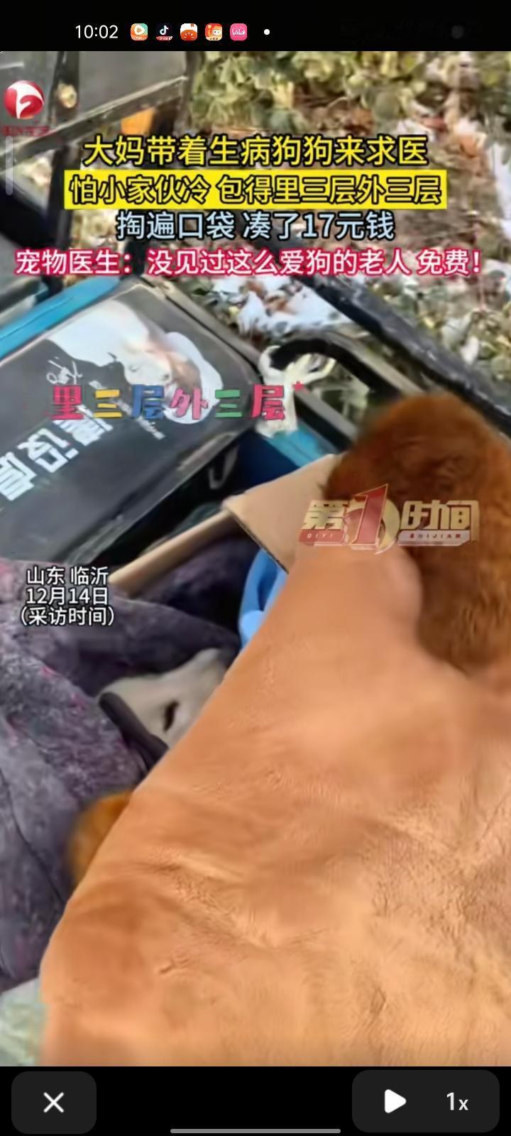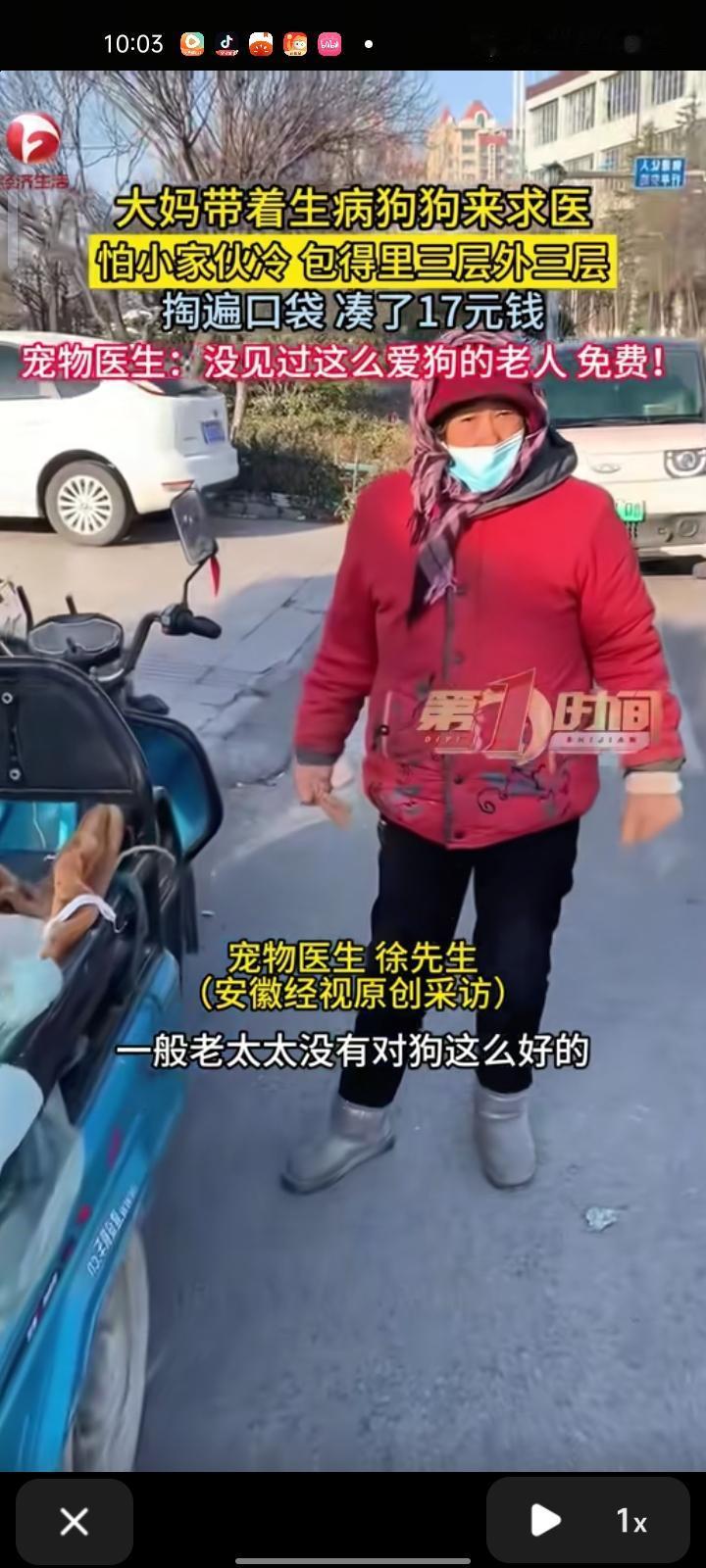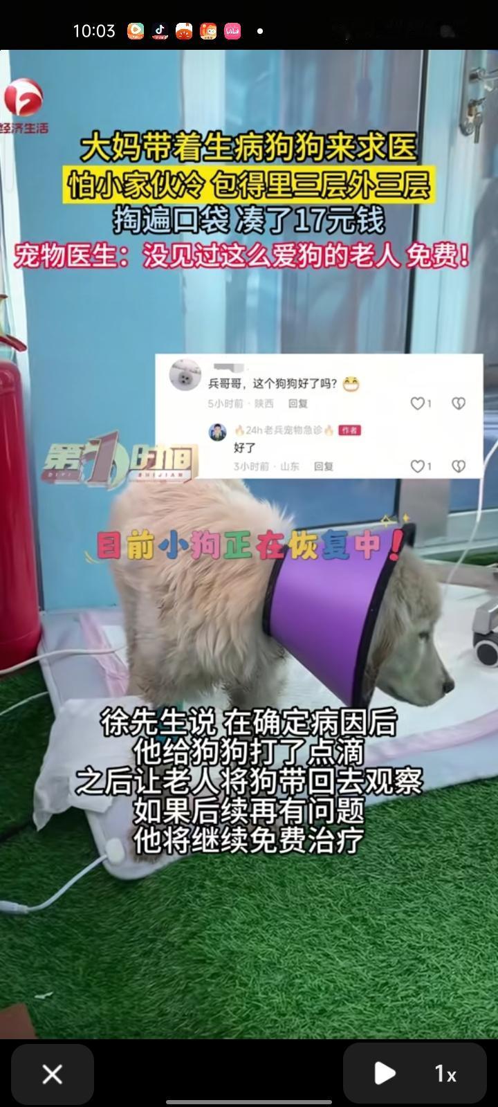 12月14日,临沂市沂水县。大姨带着生病的狗子求医,怕它冷就给它包里三层外三层的。宠物医生看着很感动,大妈询问带狗子看病要多少钱,并翻遍口袋掏出17块钱塞给他,被宠物医生婉拒。 宠物医生说,确认病因后,他给狗子打点滴,之后让老人把狗带回去观察。如果后续再有问题,他将继续免费治疗。