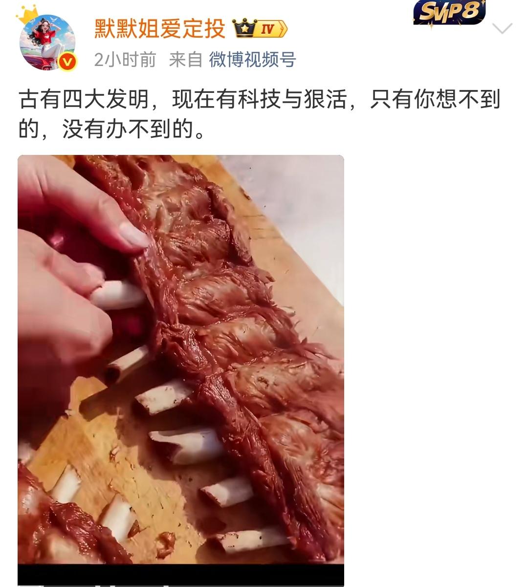 叹为观止,食品造假技术登峰造极。 (如图所示)有网友拍摄的视频中披露,食品造假技术又升级换代,如今排骨、大鸡腿等食品都可以用新技术合成或者生成,外观上看,足以以假乱真,惟妙惟肖。真是没有做不到,只有想不到,有些人的科技与狠活都用于造假了。