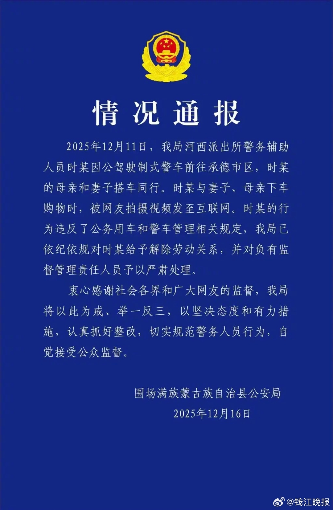 #警方通报一警车下来3人牵着宠物狗#【“警车上下来3人牵着宠物狗”,河北围场警方通报:母亲妻子搭警车同行购物,辅警时某被解除劳动关系】12月16日凌晨,河北省承德市围场警方发布情况通报:12月11日,我局河西派出所警务辅助人员时某因公驾驶制式警车前往承德市区,时某的母亲和妻子搭车同行。时某与妻子、母亲下车购物时,被网友拍摄视频发至互联网。时某的行为违反了公务用车和警车管理相关规定,我局已依纪依规对时某给予解除劳动关系,并对负有监督管理责任人员予以严肃处理。此前报道:据澎湃新闻报道,近日有网友反映,12月12日,河北省承德市承德县下板城镇文博天合园5号楼10号底商附近,一辆车牌为“冀H1288警”的警车疑似公车私用。视频显示,驾驶员与两名女子下车后径直走进一家水果店,三人均未着警服,其中一人还牵着一只宠物狗。12月15日,承德市承德县公安局督察部门工作人员回应称,他们已经接到这一投诉工单,经核查,这辆“冀H1288警”的警车是承德市围场县公安局车辆。(来源:围场公安、澎湃新闻)