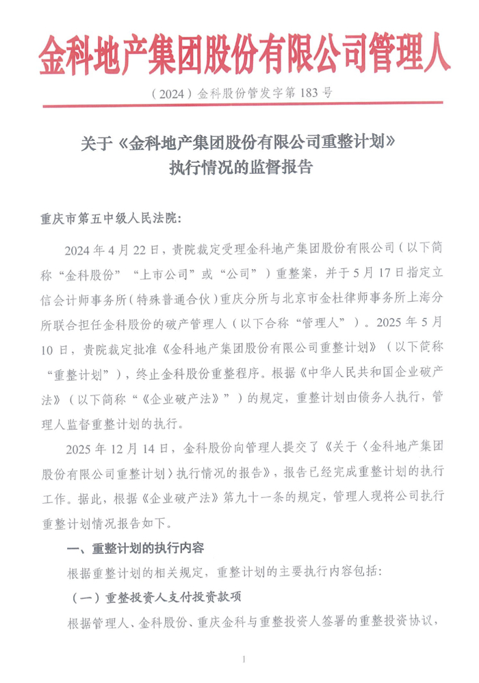 2025年1月,金科股份公布重整计划(草案),历经多次债权人会议表决,5月11日,重庆市五中院裁定批准金科股份及重庆金科的重整计划并终止重整程序。经过7个月执行,重整计划顺利完成。