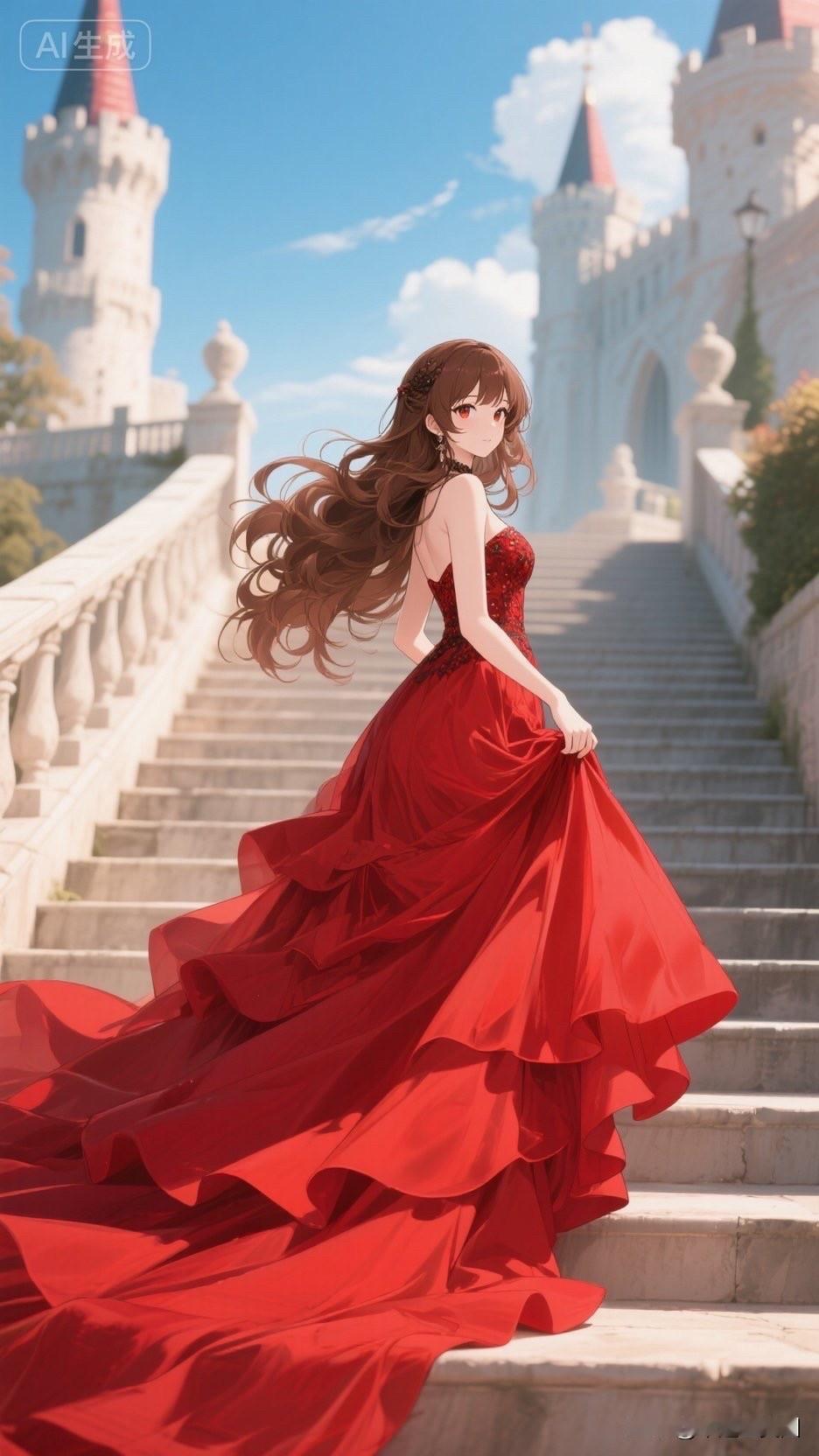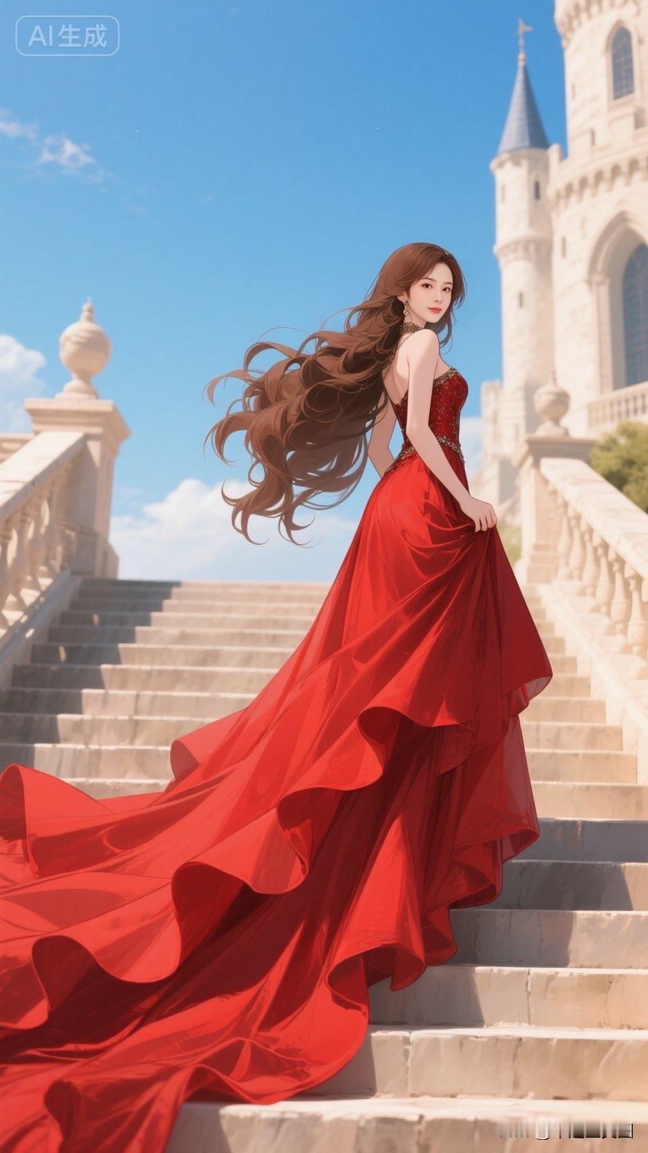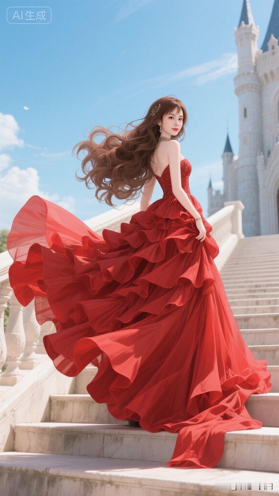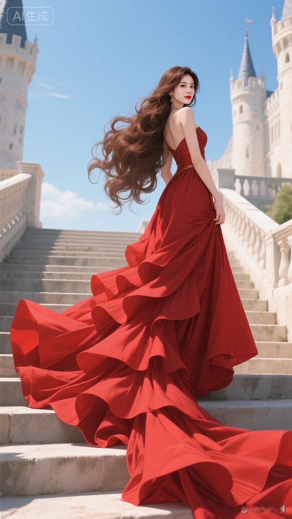 梦幻童话城堡前,红裙飘逸,宛如公主降临